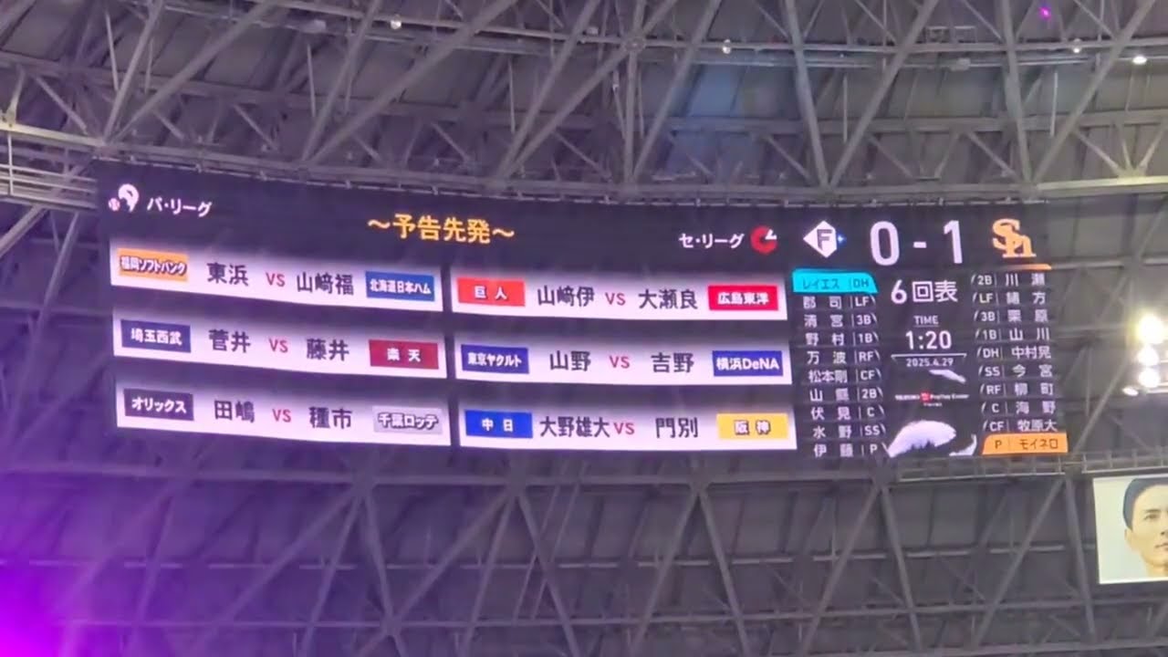 20250429 巨と福也!明日翌日・予告先発投手の発表【福岡ソフトバンクホークスvs北海道日本ハムファイターズ】&他球場 5回ウラ終了後@みずほPayPayドーム福岡・ライト外野