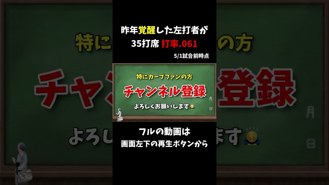 はい、どうもナンです。今回のテーマ講師 でゼ府長昨年好調だった元育成打所につい てはい。昨年打撃で成長を見せたあの選手 今期はさらなる成長が期待されておりまし たが4月下旬現在講手でかなり苦しんで おります。今回の動画では今期の成績を 振り返っていきチーム状況について考察。 最後に私個人の考えも合わせて話していき ますので、最後までご視聴よろしくお願い いたします。このチャンネルではカープに 関する情報やネタ動画を投稿しております ので、特にカーファンの方はチャンネル 登録よろしくお願いいたします。では本編 スタート 。今回話の中心になるのは気づきの方も 多いでしょう。そうです。