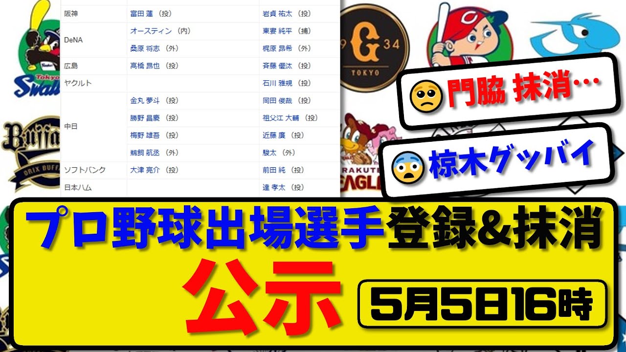 【公示】プロ野球 出場選手登録&抹消 公示5月5日16時発表|門脇&岩貞&斉藤&前田&達&椋木&博志&高島&山中&渡部ら抹消|浦田&森&元ら登録【最新・まとめ・反応集・なんJ・2ch】