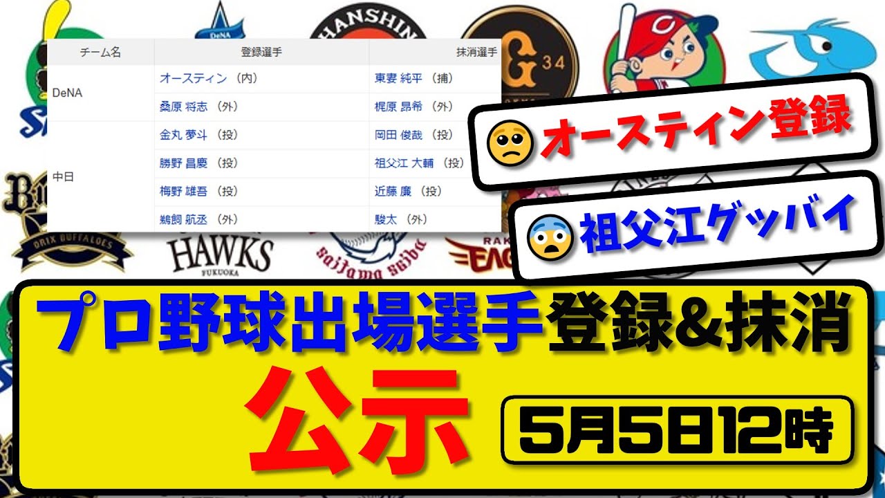 【公示】プロ野球 出場選手登録&抹消 公示5月5日12時発表|東妻&梶原&岡田&祖父江&近藤&駿太ら抹消|オースティン&桑原&勝野&梅野&鵜飼ら登録【最新・まとめ・反応集・なんJ・2ch】