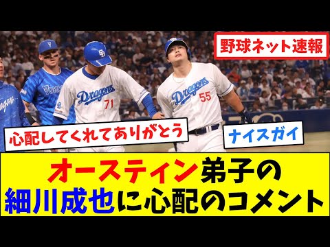 オースティン弟子の細川せ夜に心配の コメント。下半身のコンディション不良で 離脱していたDNAタイラーオースティン ナイヤッシュ33が負傷交代した弟子の 継承を祈った。元同僚で自トレもにした 中日細川せ夜外ガヤッシュ26が5回湯で 1塁まで走っている最中に右太も裏を抑え て6回の守備からベンチに知り添いた。 すぐ近くの1塁のポジションから顔を歪め て足を気にする細川の姿を心配そうに 見つめたンはプロ野球選手誰も怪我して 欲しくないですし特に細川選手みたいな仲 のいい友がやって負傷交代するのは本当に 嫌だなと思う部分があります。彼の症状が 重大なものではなくすぐ戻るようなもので あることを祈りますと継承を祈った。親友 だって国籍も言語も違う人とこまで仲良く して心配するなんて大和なんていいやつな んだ。 細川茂也選手は侍でも山本大選手とベンチで話していたりが印象的でしたが、フルスだけあり細川選手にとっても電影選手は心強い存在なのでしょうねと改めて思いました。 オースティンって強くて優しくて2 枚目言うことないやないか。 広島戦で細川が手に子宮を食らってそのまま退場した時は広島の誰からも心配する声は聞こえなかったのだがオースティン選手は優しいね。 本当ティン選手はプレイも全力だし、こういった優しさもある素晴らしい選手、細川選手も継承であることを願う。 そうだね。 俺も嫌な気持ちになってしまうよ。どうか継承であってほしい。そして横浜戦以外で大暴れしてほしい。 今日も試合前細とTA は長いこと話していたし、本当に心配なんだと思う。でも肉離れなら長引きそう。オースティンナイスガイしてくれてありがとう。 オースティン以前10 日の木下投手が去された後の試合で米の帽子に 98 と書かれていたことを思い出した心ある紳士 米時代からその素失を見込んでアメリカの自主トレに対道させたりと何かと仲が良いからね。 オースティンありがとう。ご視聴ありがとうございました。チャンネル登録お願いします。 Yeah.