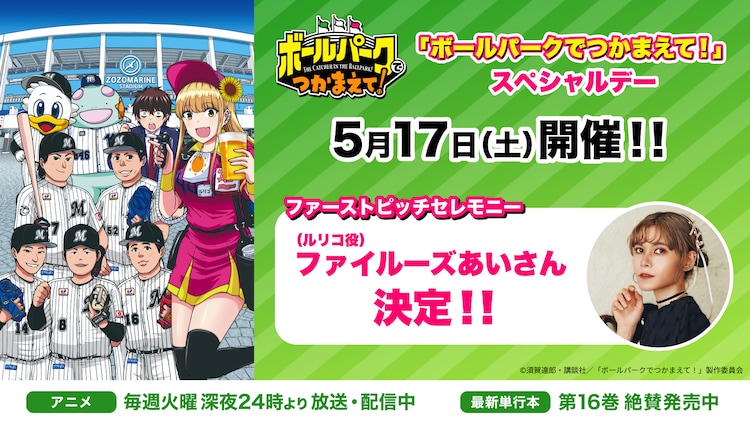 「ボールパークでつかまえて!」千葉ロッテvs日ハム戦の始球式にファイルーズあい(コミックナタリー) – Yahoo!ニュース  Yahoo!ニュース声優・ファイルーズあい、ロッテ戦で始球式「まさか自分が球場に立つ日が来るとは…」(オリコン)  Yahoo!ニュースファイルーズあいさんが2025年5月17日(土)開催『「ボールパークでつかまえて!」スペシャルデー』の始球式に登場!  PR TIMES【ロッテ】「ビールいかがっすか〜」。『ボールパークでつかまえて!』声優のファイルーズあいさんが始球式  dメニューニュース「ボールパークでつかまえて!」千葉ロッテvs日ハム戦の始球式にファイルーズあい(コメントあり)  ナタリー