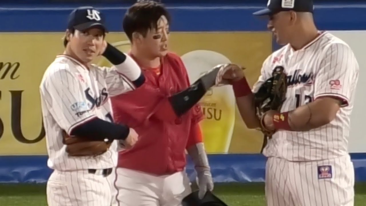 リクエスト中、小園海斗がパイセン山田、オスナと談笑!広島東洋カープvs東京ヤクルトスワローズ 2025年5月7日