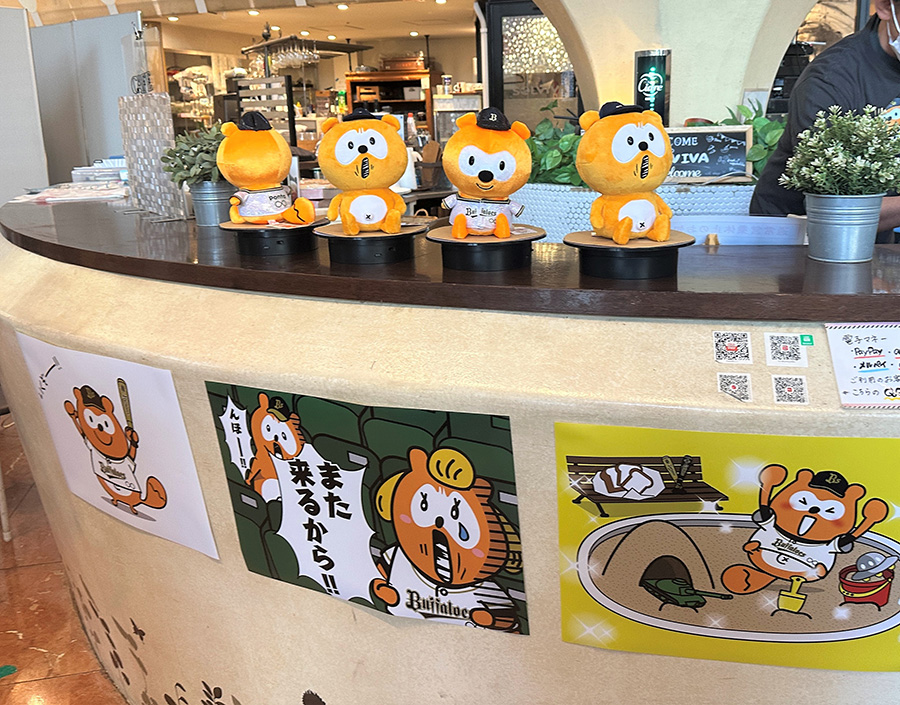 今回のカフェのコンセプトは“これまでの光と闇の歴史”。「成績が低迷していたころの悔しさも、優勝した時の喜びも、全部バファローズ☆ポンタは見てきました。どちらも欠かすことのできない大切な思い出としてこのカフェに詰め込みました」と奥山さんは話します。これまでのさまざまなシーンを振り返るイラストが、カフェのいたるところに散りばめられています。
