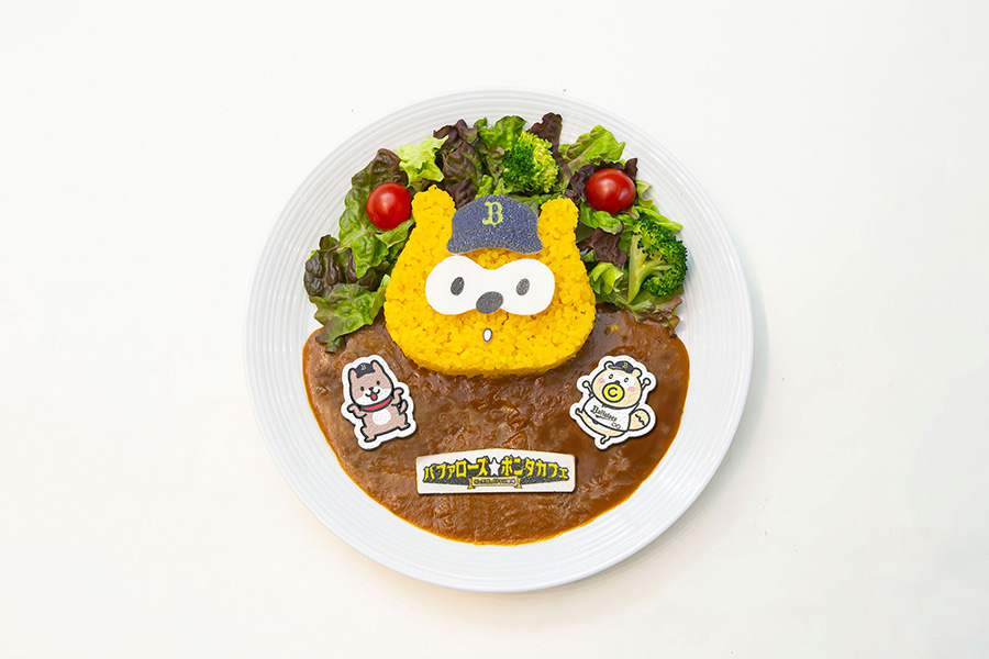 「華麗(カレー)に勝つ!バファ☆ポンポジポジカレー」には、ポンタの飼い犬「デコポン」と弟の「ばぶポンタ」がカレールーの上にトッピングされています。このほか、「ホットひといき コーヒー裸ッテ」や「高めの球(ハイボール)」など遊び心あふれるメニューがたっぷりそろっています。