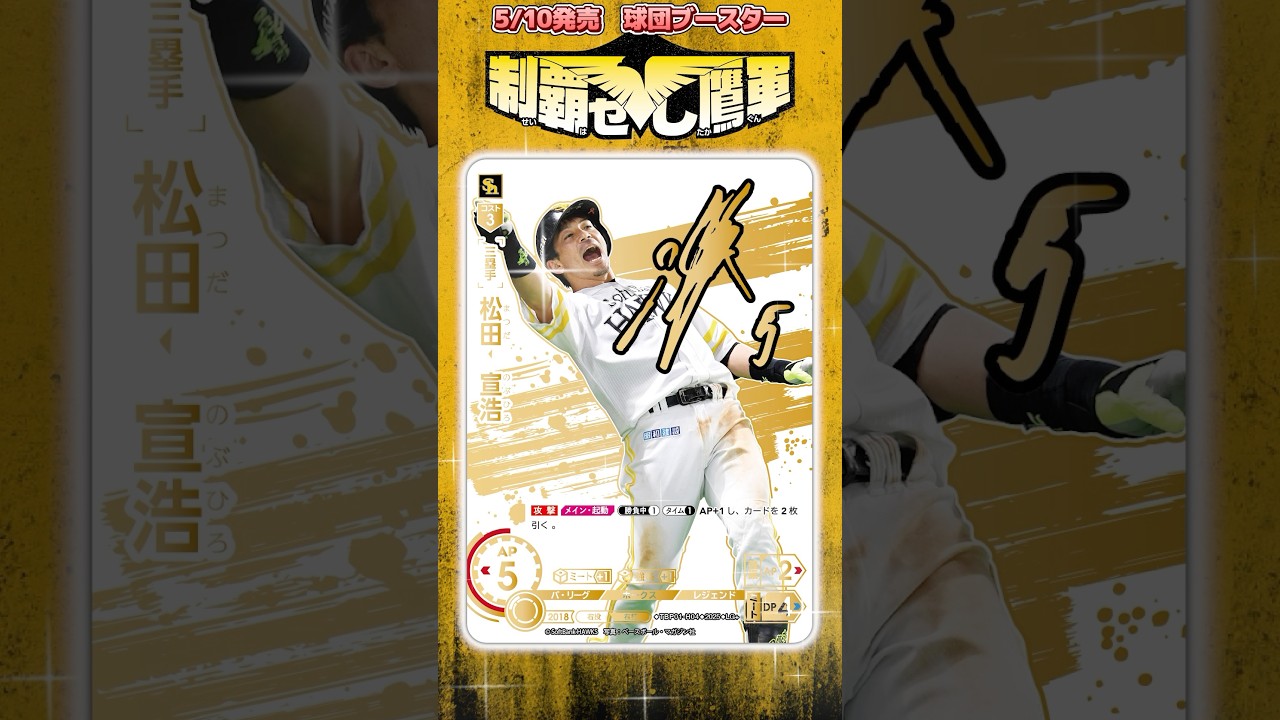プラ級カードゲームで松田の選手が登場。 チームを助けて自分もパワーアップする 特殊能力を持っているぞ。ホームランを 打って叫めあ。本日は特別なカードもご 紹介。写真が異なる特別仕様のカードを 収録。さらに箱子体が乗った超豪華な カードもごく稀れに出現。球団ブースター 福岡ソフトバンクホークス高軍5月10日 土曜日発売。発音ワ