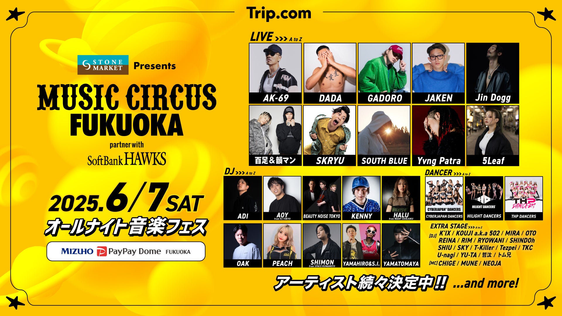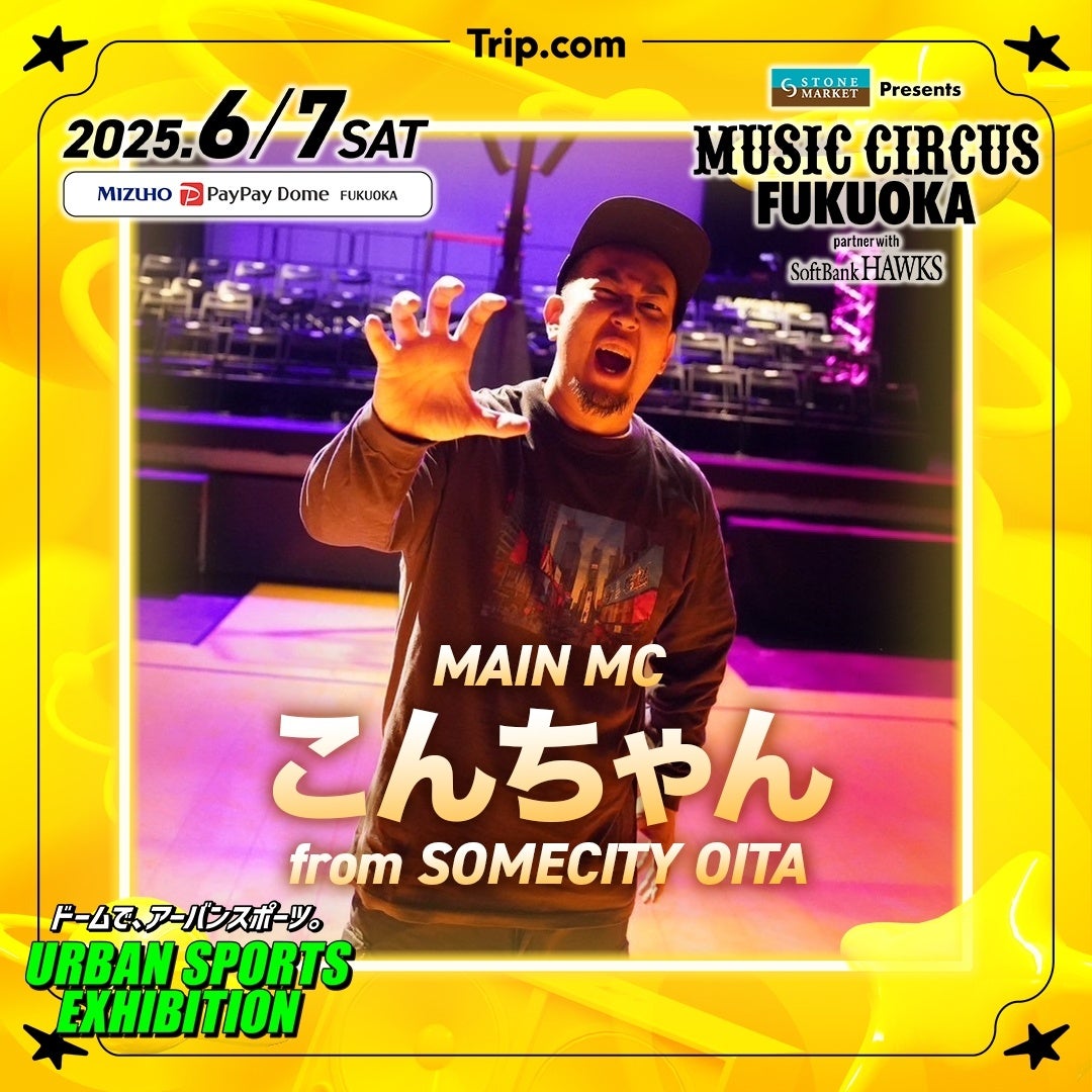 株式会社TryHard Japan(大阪市中央区)は、2025年6月7日(土)にみずほPayPayドーム福岡で開催されるオールナイト音楽フェス「STONE MARKET Presents MUSIC CIRCUS FUKUOKA partner with SoftBank HAWKS」に福岡ソフトバンクホークス オフィシャルダンス&パフォーマンスチーム『ハニーズの出演、スポーツコンテンツ「URBAN SPORTS EXHIBITION(アーバンスポーツエキシビション)」についてお知らせいたします。