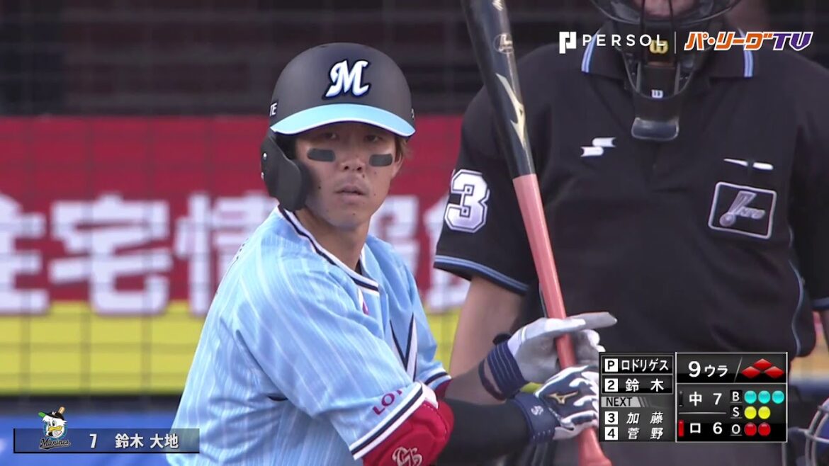 2番・ファーストでスタメン出場の千葉ロッテ・鈴木大地。守っては複数ポジションをこなし、今年は打撃も好調。今日の試合では2本塁打を放ち、9回の好機で劇的な幕切れを呼び込んだ。