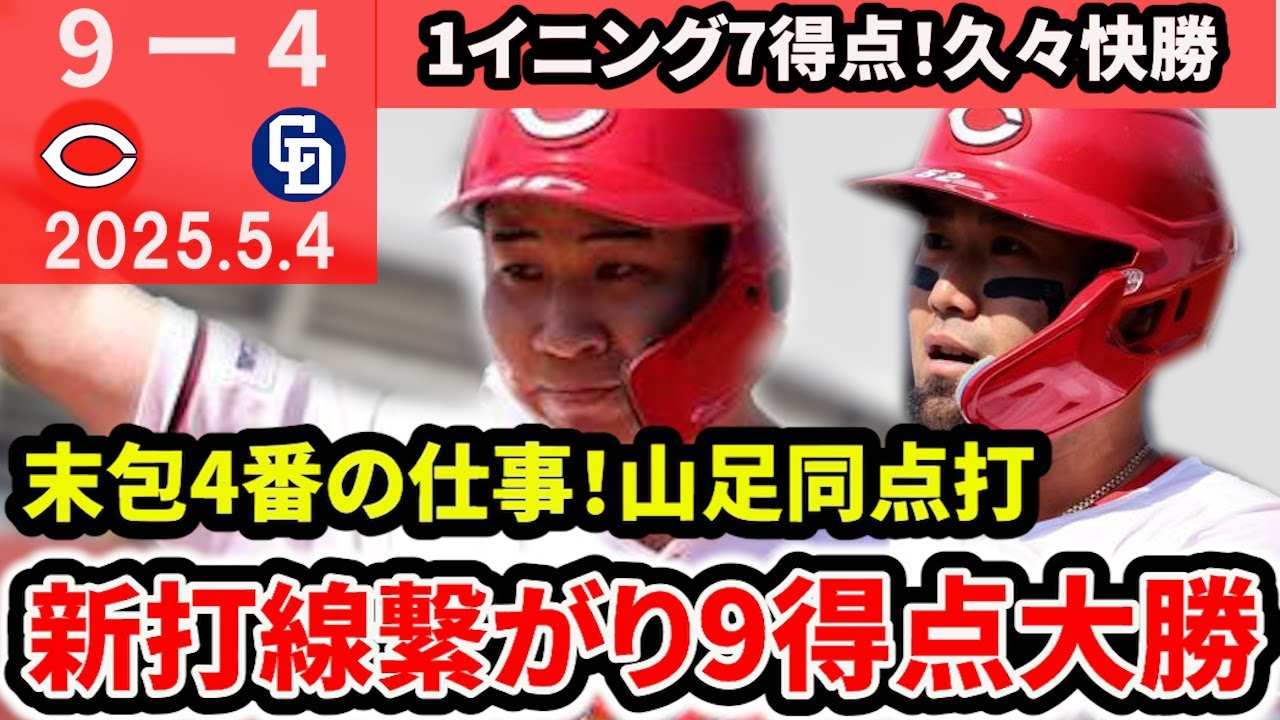 カープすきじ系チャンネル 。はい、どうもカープスキンです。今回は 5月4日ドラゴンズ戦振り返ります。え、 この試合9対4でカープが勝ちまして2 連勝ということで、え、7連敗の後2連勝 して、え、借金もね、返済で5割に戻す ことができました。久しぶりにですね、ま 、7得点、え、奪ったイニングもあったり ですね、打線が繋がって見ててね、え、 楽しい試合になったんじゃないかなと思い ますね。いろんなね、ポジ要素ありますの でしっかりとね、振り返っていきたいと 思います。え、是非最後までご覧ください 。え、またこのチャンネルの登録、まだの 方登録もよろしくお願いいたします。それ では振り返っていきましょう。さあ、では まずね、打撃陣から振り返っていきたいと 思います。え、1番の中村小選手という ことで2試合連続ね、1番で起用されて ヒットはね、え、ないんですけど、ま、 アプローチは悪くないのかなというような ね、印象は思います。え、1打出目のね、 三振とか、ま、ちょっとね、え、良く なかったんですけど、ま、その後のね、3 回と4回、え、の打席なんかはですね、ま 、センターフライとライトフライではね、 え、あるんですけど、ま、3打、2打席目 のね、え、センターフライなんかも しっかりと、え、打ちに行く球を打って3 2からね、え、いい感じでセンターフライ でしたし、その次の打席のね、ライト フライもね、え、ま、悪くない感じだった ので、ま、状態は悪くないかと、え、思っ ています。ま、ただね、え、2軍戦では 秋山選手が復帰してですね、ま、即、え、 似んだということで、ま、1番センターの ね、え、ま、強力なライバルが返ってくる という中で、え、ま、スタメン取るために はチャンスね、残り少ないと思いますので 、やっぱりね、目に見える結果という ところをね、また出して欲しいなと期待し てます。で、菊選手、え、こちらも2試合 連続2番企用で4打1だということで、え 、良かったのがね、6回の裏ね、ヒット ですね。え、2からライトマイヒットを 打ったんですけども、これがもう3連敗 時代ね、思い出させるような、え、さすが の右打ち、内のボールをね、え、あ、やっ て12塁感破ってライト前に打って、で、 1塁ランナーね、しっかりと走って13、 3塁のチャンスを作るというところがね、 ま、よく強かった時代見れた攻撃なので、 ま、相変わらずね、ああいうね、いい バッティングをしてくれるなということで 、ま、こういうとこがあってね、2番企用 に、え、据えたいっていうのもね、首脳人 の意図としてはあるのかなと思いました。 で、ファビアン選手3番器用で、え、4 打数アンダ打田2打点ということで、え、 4回ですね、え、チャンスメイクの2ベス 、え、さらに2点タイムというね、え、 活躍を見せてくれました。で、4番末カ 選手は5打数3打2打点ということで、ま 、今日もね、4番の仕事、え、で、2打点 ですし、モ打賞ということで、え、これで 100打席到達したんですけど、打率はね 、まだ3割超えているよという非常にね、 状態が、え、いいですし、ま、かなりね、 え、進化してるなと思わせてくれる活躍 でした。で、坂倉選手、こちらも5打数3 だということで、え、復帰後初の毛打賞と いうことになりました。ま、それぞれね、 え、内容もね、いいですよね。ま、この、 え、3連戦ホームランもね、打っているん ですけど、え、1打席目なんかはね、え、 岡田投手左ピッチャーのね、いい スライダーをね、ま、しっかりと捉えて 12、2塁間、え、で、2席目なんかもね 、え、ま、いい角度で上がって、ま、 ライト前ということで左ピッチャーのね、 逃げる球に対してもやっぱりね、肩開い たりしないので、こうやっていい感じで、 え、打球角度もついたりして打てていると いうのがね、分かる1本だったのかなと 思います。え、で、最後のヒットはですね 、ま、センター前ということで、ま、そこ もね、しっかりと、え、センターにね、 綺麗に打っていましたので、え、 バッティング技術さすがだなということが 分かったので、え、もっとね、チーム 引っ張って欲しいと思います。でドバイ 選手が5打+1アダ、え、4試合連続 ヒットとなるライトマイヒットね、え、 打ちまして、ま、得点しているんですけど 、ちょっとね、チャンスでの打席内容が 良くないということで、ま、こういう風に ランナーなしの場面ではいい感じで打っ てるんですけど、この試合もね、2回かな チャンスで回ってきたんですけど、え、 いずれもね、え、ま、三振ということで なんかね、チャンスになると当てに行っ たり、え、しているので、ま、多分真面目 な選手なんですね、色々考えすぎなのかな ということもね、思われるので、ま、 しっかりとね、え、ランナーいない時と 同じように打ってくれれはヒットも増える のかなと、え、思ってるのでね、え、もう 1回ね、結果を残して欲しいと思います。 で、山橋選手が4打1打1打点ということ