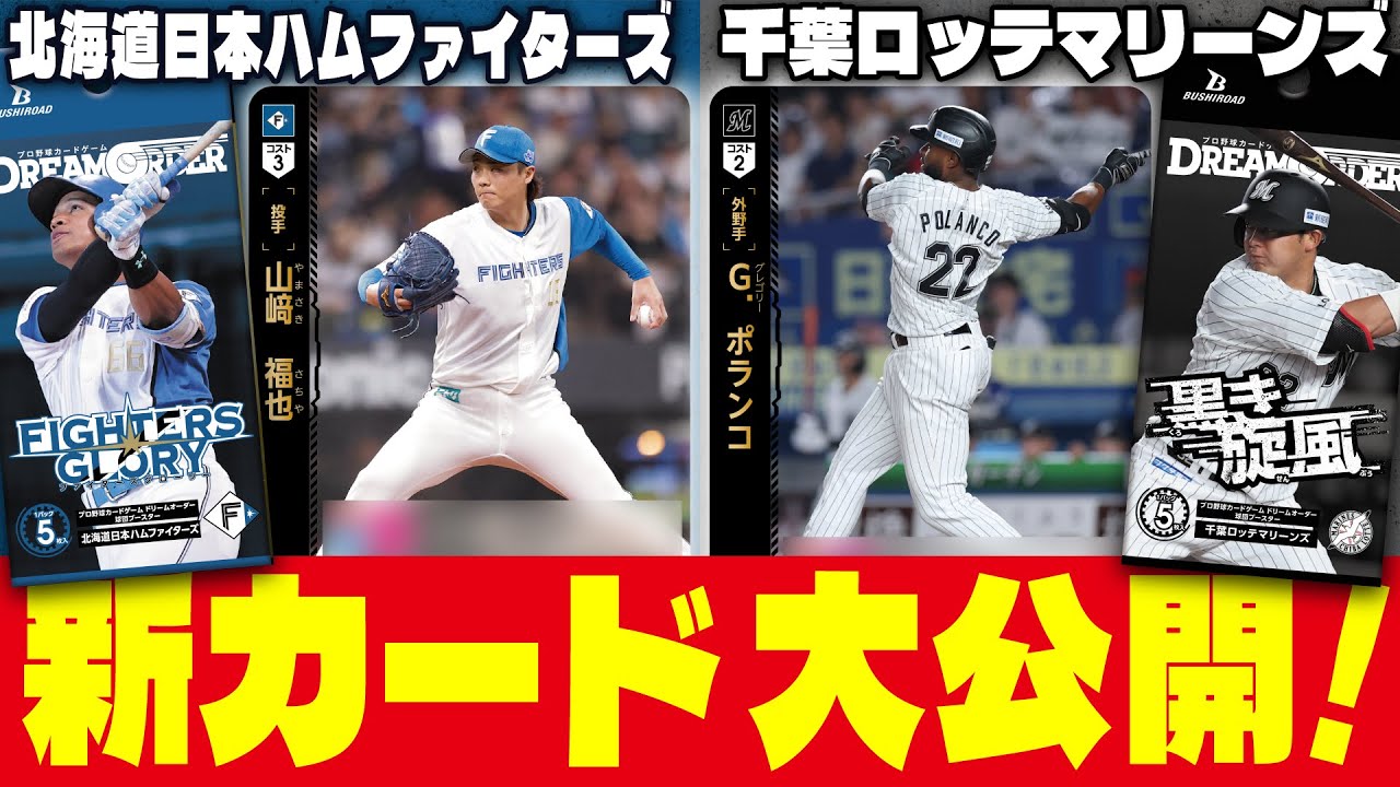 どうもポシマックスのかやんです。 ボシマックス誠義です。コばピです。 お願いします。お願いします。 さあ今回の動画は小林ピと 3人でトリオでやらせてもらうと。 トリオだ。トリオだいうことはですね、5 月24 日発売球団ブースター横浜DNA ベタスの星東京ヤクルトソワローズ夢の共演のカード紹介に加え初来まで 1ヶ月を切りました。 球団ブースター、北海道日本ハムファイターズ、ファイターズグローリー、千葉ロッテマリンズ、黒旋風の収録カードも紹介しちゃいます。よ やよ。 これが本当に僕の最近の栄養になってます。 栄養になってる。 はい。あ、泣いて。あ、ちょっと待って。かやんが 泣いてるよ。え、待ってました。本当だ。 おお、もう俺発売しないんじゃないかなって。遠すぎて。 遠すぎて。 もう勘弁してよってぐらい待ってましたよ。僕は本当にしました。 いや、ありがとうございます。 本日は皆さんが気になってるあのOB 選手の能力も紹介しちゃいます。 いいですか?盛り上がっていきましょう。 はい。はい。 それでは早速やっていきましょう。 レッツゴー。レッツゴー。 まずはベイスターズとスワローズのカード紹介していきます。じゃあまずベイスターズはよろしく。はい。 横浜DNAベーサーズからはスーパーレア のさ高弘選手です。コスト2AP5の 外野手で攻撃メイン能力が総者が2類また は3類にいるならAP+1する打撃判定を 行うならさらにダイスプラ1する能力で 基礎能力でミートプラ1強心プラス1 を持ってるカードでございます。 チャンスに強いっていうね、最選手の そうですね。ま、これはもうマシンガン打線のね、一角を担ってもらうっていうねところで以前紹介した鈴木選手 はい。前のバッターがってやつですよね。 鈴木選手が前のバッターかっていうところもあったので、ま、そっからどんどんどんどん続いて打ってけよみたいな形で 2塁または3塁ならっていう能力になって でここはねどっちでも打てるんで そうですよね。これ かつて手札に残ってても守備でもしっかりと使える数値を最低持ってしっかりしてる。 これはね、結構使いやすく組み込みやすいのかな カードやってます。 ありがとうございます。 じゃ、続いてはスワローズ正義よろしく。 はい、 任せて。続いては東京ヤクルトスワローズから宮本深也選手です。コスト 2AP5 の遊撃で攻撃メイン能力でミートで勝負を行うなら AP+1する。 守備、サポート、本量発表能力で相手の打車がアウトになった時山札の上から 2枚を見て2 位の枚数を山札の上に望む順で置き、残りをレストエリアに置くという能力を持っております。これはもう本量発揮が、 そう、本量吐きがアウトになった時なんでアウトに置いてから 2 枚チラチっと見てそれを上にちゃんと置くか 1枚レストに置いて1 枚選べていうのが何でも選べるんですよ。 なるほど。山札をこういじれちゃう。 そう。 山札の上をいじれちゃうんでピッチャーの覚醒だ。上に 1 枚でこっちはちょっとバッターの方がいらないなっていうところで調整ができたりとかもそう山札を削るってことがね、しっかり 2 枚落とすだけでも十分このゲーム強いのでまたサポートもね。 ミートDP4ミートDP4と 強いなやっぱりしかも打つ時もね、AP6 になりますから実質は 2000本ワでも打ってますからね。 そう。 これ素晴らしい使いやすい選手かなと思います。はい。 それではファイターズグローリーから新カードを紹介したいと思います。今回も非よろしく。また。まずはスーパーレアの松本 5選手です。コスト3AP5 の外野種で攻撃メイン能力が覚醒AP+1 する。攻撃メイン起動能力で勝負中手札の戦術カードを 1枚捨てるとカードを2 枚引ける能力を持っております。5番ピ。 この松本選手はアップデート版の アップデート版に2024 年バージョンになっていてはい。 写真がね、写真が すごい内終わりですよね。 覚醒+1 やりながらかつね、戦術カードを捨てるとカード 2枚引ける。これつの時代も強いのよ。 いつの時代も ファイターズはいつの時代もこの暴力が強くて、ま、ぜひ一瞬使ってほしいなっていうところと今年の活躍も期待して収録になっております。ありがとうございます。 続いてはレアのびトライ選手です。コスト 1AP5 の保守で守備サポート本量発揮能力でこのカードをプレイした時投手の APが4 以上ならサポートに強心DP3 する能力を持っています。これは これね気になっちゃうよね。 気になっちゃいます。さすがに今までの投資で AP4 超える投士ファイターズにはいなかった。 はいはい次のカード行きましょう。 もしかしてまさかまさか 続いてはスーパーレアの山崎さ選手です。 コスト3DP6 の先発投手で攻撃メイン能力覚醒AP+1 守備メイン能力で総者がいるならDP+1 守備メイン能力で覚醒DP+1 する能力を持っています。そして基礎能力でミートプラ 1を持ってる選手でございます。 タッチア選手打ちます。 打ちますね。た打ちますよ。いや5 じゃないすか。やりたかったんですよ