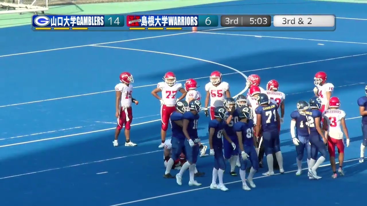 現在この今シーズンの状況を簡単にえ ホームページから発生したものでご紹介さ せていただきます今シーズンの中国 アメリカンフットボールはえ6校全てが 甲子援ボールになることができるというえ 並列する形でリーグ戦が運用される形に 変わりましたAブロックBブロックに3項 ずつが当たりましてその勝敗によってえ 上位2チームがトーナメントに出場し甲子 ボル地上と優勝をきめという形になって おります言い換えますとこのリーグ戦で3 位にしまった場合にはその時点で 今シーズン終了となりますえその状況から 考えましとえ今シーズンえ今現在A ブロックの一戦が行われておりますが山口 大学が白星先行というところですのでこの 試合勝利となりますと2勝礼拝となり おそらく1位という形で通過になります 山口え2位は山口東京理科大学と島根大学 で争といった格好になりますが島根大学が 勝ちますとこの状況は大きく状況変わって まいります今度は根大学がアドバンテージ で取りになる能性が出るという形になり ますこのような格好で1勝1の状況が非常 にリーグ戦の状況大きく変わります状況に なる今シーズンのえ中国学生リーグを簡単 にご覧いただければ幸いに思い ますその意味ではこの1戦島根大学勝する か田舎によって大きく情勢変わるA ブロックの状況になりますがさあその試合 まもなく後半戦となり ます戦は山口大学のキックオフで試合再開 という形になり ます山口大学のキックオフを務めますのは 11番の木山笠岡高校出身1回戦が務め ます対しまして島大学はリターナーに10 番と14番を配置しています10番は好調 なラウンを見せています村田日田高校出身 3回生14番は南浦え沖島前高校出身1回 戦です こちらもえ沖からの3戦という非常に特色 ある選手がえリターナーに入ってい ますさあそのえ14番がリターンに入り まし [音楽] た高に中央展開トパの展開測りましてえ 自陣26ヤ付近を加工していますリターン しましたのはえ島根大学の14番の南浦 でした沖島前高校出身の1回戦 です [拍手] デさあ島根大学の攻撃に入ります島根大学 自陣28ヤードからのファースト [音楽] テ プレッこれは山口はまずディフェンス見せ たまず中央へのランプレを展開しようとし ましたしかしこの時にディフェンスライン が殺しましてこのラン阻約1ydから 2ydロスに変えてい ますさあ大学セカンドダウン12のえ セカンドダウンの状況になります パス成功しかしイエローフラッグ反則が 発生してい [拍手] ますさあここでロングパスを投じましたが この時にディフェンスの競り合った際に何 らかの反則があった模様です オフェンスの反則の様 [音楽] [拍手] ですのパスインターフェアですパス インターフェアは前パスが浮いてる際に 相手選手を接触妨害する反則ですこれは オフェンスディフェンス共にありました 場合は成功されます今回はオフェンス側に ありましたしかしこれを山口大がらず プレー成立させサードに変えます従いまし て閉まり第サダンイレブン [音楽] [拍手] ドラプレーパスに見せかけたランプレーを 投入しましたクターバック下がりパスに 見せかけたところそのスにラニバックに 託し中央カウンター気にダンプレですが これも山口大学がディフェンス対応しまし て2ヤードほどの原にとめフォースダウン に変え ます大学フスダウンフォーメーション変え ますパントフォーメーションを取りました [拍手] さあこのパントは若干シャンク組に高く 上がりましたこれを果敢に山口大学抑え まして相手人の位置からの攻撃位置を確保 する形に変えました変えています山口大学 の攻券取り返し山口大学の攻撃変り [音楽] ますかちゃんよしさんメッセージ ありがとうございます3年あればえ目指せ 55のメッセージこれは山口大学に対して ですねえ非常に劇になったと思います山口 大学ボート部のメッセージえ山口 ギャンブラーズファイトのメッセージも これも山口大学の非常に強力なエルになる と思われます山口大学相手陣47ヤから ファーストダウン10 さあまず中央のランプレー入っ た先ほどから好調なランプレイを山口大学 このシーズでもまず最初の一手として展開 しました中央密強い点にテイルバックを 突っ込ませるブラストプレイ相手 ディフェンス粉砕しまして1点突破し約2 ヤードの原因を果たしてい [音楽] ます山口大学セカダウン8ボール相手陣 44 Y ス [音楽] 止さあこれは島大学を見せた今度 オプションプレーラニワックにピッチし まして右オープン展開測りました11番の スピードによった総力に期待せという ところですがここはディフェンス陣殺し まして逆に1ヤロスに変えています [音楽] ここは55番77番が対応した模様です 55番は伊藤倉吉東高校出身3回戦77番 が本田松山中央高校出身2回正 [音楽] です山口大学 サーダナパス不成功ナイスパスカット [拍手] ここで山口大学はパスによって状況を打 測りました右方向にいたレシーバーへの パスでしたがしかしこれを台素晴らしい アグレッシブな