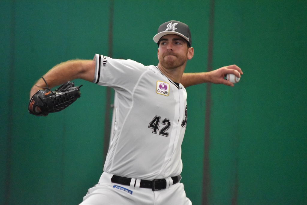 Lotte’s Brian Sammons pitched 5 2/3 innings Rakuten on the 15th, hit, strike out and allowing no runs, earning his first win since coming to Japan.