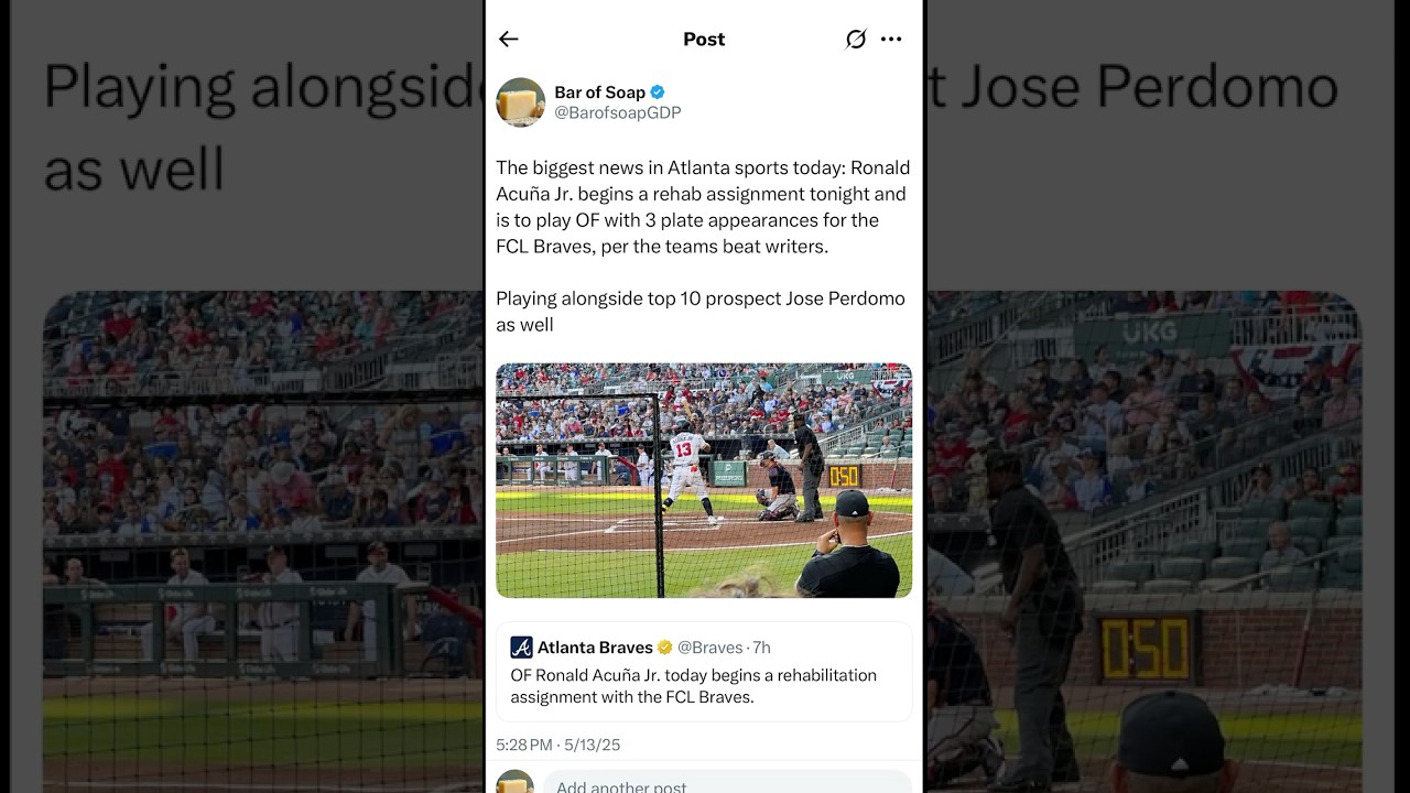 The biggest news in Atlanta sports today: Ronald Acuña Jr. begins a rehab assignment and is to play OF with 3 plate appearances for the FCL Braves. Per the teams beat writers Mark Bowman Justin Toscano David O’Brien