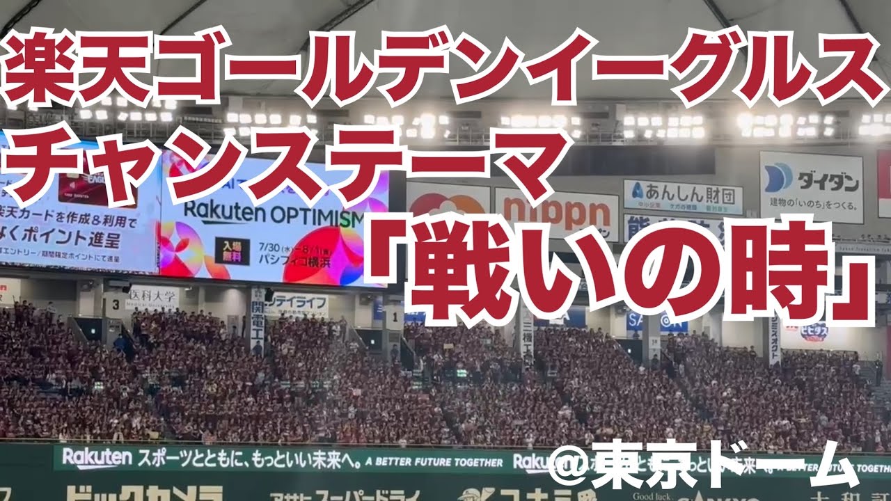 楽天ゴールデンイーグルス チャンステーマ「戦いの時」 2025.05.15撮影 @東京ドーム 楽天ゴールデンイーグルス チャンステーマ「戦いの時」 ◾️歌詞 戦いの時が来た 決めろ一撃 ラララララ… みちのくへと勝利運べ 我らとともに 敵を倒せ オイ! オイ! オイ! ○○! Tohoku Rakuten Golden Eagles東北楽天ゴールデンイーグルス NPBHUB.COM | The Fanbase of Nippon Baseball & Nippon Professional Baseball