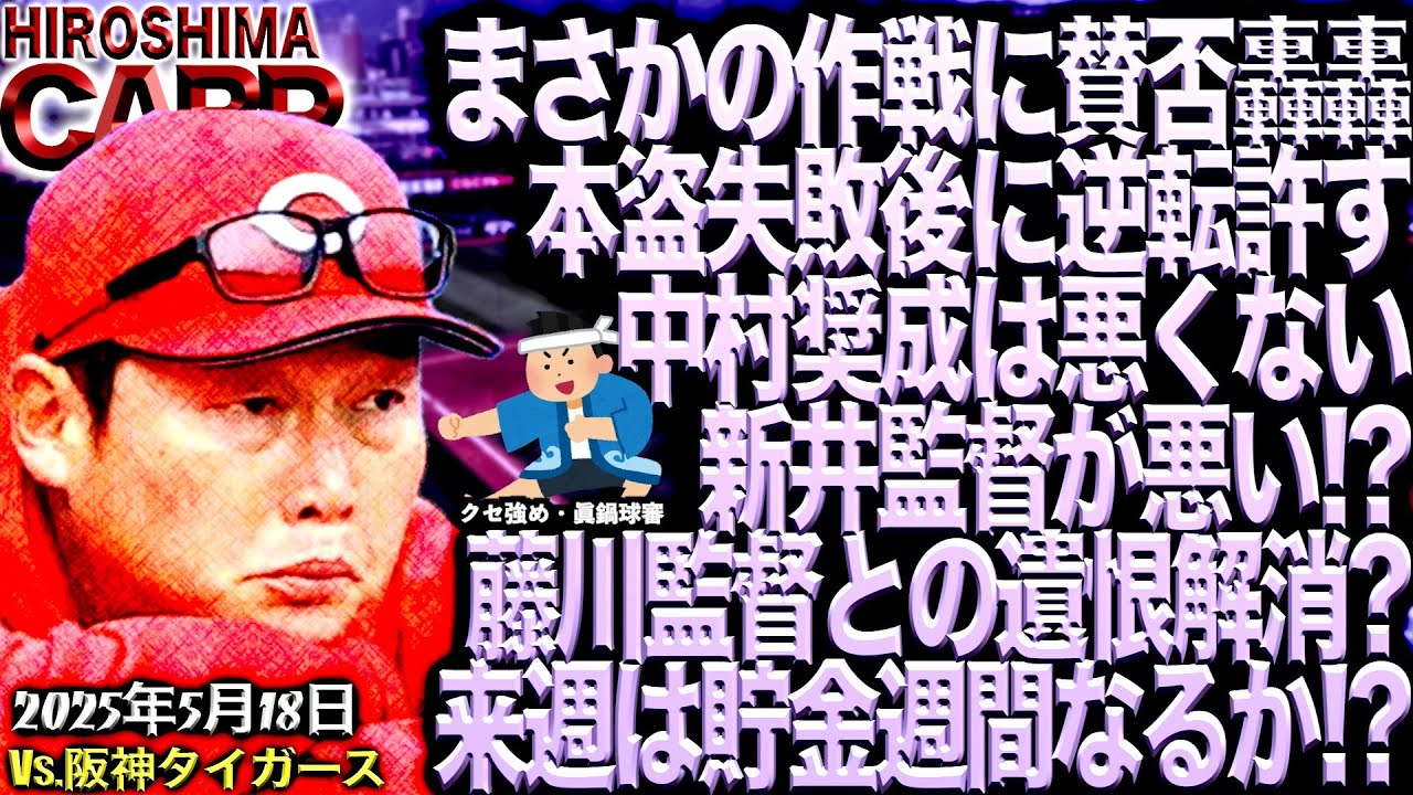 お疲れ様です。KTです。今日は5月の 18日ということで本日もKTチャンネル ご視聴いただきましてありがとうござい ます。これだからカープファンはやっ とれんということで悔しいゲームとなって しまいました。はい。で、え、まず本題に 行く前なんですけども、昨日ですね、 ちょっと突然、え、告知なしに動画お休み させていただきまして、本当に申し訳 ございません。えー、作る気ね、満々だっ たんですけども、ま、家庭の事情と、え、 いうことでね、ご理解いただきたいなと いう風に思います。あの、決してね、試合 内容がどうとかそういうね、話ではないの で、ま、明日、昨日の試合を含めですね、 この週末のタイガー戦のこの3連戦の総括 、え、明日の動画でね、出そうかなという 風に思っておりますんで、ま、昨日の部分 をですね、え、ちょっと分厚く喋って いこうかなという風に思います。はい。で 、ま、家庭の都合を少しだけ詳しく話して いきますと、ま、妻がですね、あの、昨日 は久しぶりにこう夜友人と、え、食事に 行くと、え、いうことになりまして、ま、 普段ね、迷惑ばっかかけているんで、え、 任しとけと、え、いう形でですね、娘との 時間を過ごしていたんですけども、まあ やっぱりね、え、父親と娘で行きますと、 こう夜のね、寝かし付けまでの、え、こう 時間というのはね、なかなか思うように いかないと、え、いうところがありまして 、ま、夕方4時ぐらいに妻が出かけていっ てですね、あの、ま、いつもですと9時 から10時ぐらいの間に寝かし付けをする という形でね、ま、途中まではあのいい ペースで進んでいたんですけども、ま、 なかなかやっぱりこう、え、やっぱり親父 と2人だからなのかな。あの娘の方も テンション上がってしまってですね。え、 なかなか寝つけなくてというところで、え 、結構ね、寝つくのが遅くなってしまって 、え、そこから動画作ろうかどうかという ところでですね、一旦は目覚めたんです けども、ま、いつもであればね、そっから 頑張ってこうパソコンの前に座ってという 形を取っていたんですけども、ま、試合 内容的にもね、そこからこうベッドから 起き上がってという気持ちにはなれなかっ たというのが、ま、正直なところではある んですけども、ま、ということでですね、 ま、そんなこともあるよというこちらの チャンネルですけども、え、今後も応援し ていただける方は是非チャンネル登録を よろしくお願いいたします。はい、という わけで本日のゲームのところに入っていき たいと思いますけども、え、まずはですね 、サムネイルの、え、回収からとえいう ところになりますが、え、驚きましたね。 ホームスチール観光と、え、いうところで 、ま、ここに関してはね、やっぱり3、P の方が多いのかな、やっぱり、え、Pが 55と、いう形にはなっておりますけども 、えー、ま、間違いなくです。ま、その 作戦、ホームスチールの作戦自体は一旦 置いといて、ま、こちらはですね、動画の 詳しい、え、振り返りの中身でね、え、 喋っていきたいと思いますので、是非とも ね、え、動画の最後までご視聴いただき たいんですけども、ま、あの、この作戦に 関してはちょっと一旦置いといたとしても ですね、やっぱりそこから流れが変わった というのはこれは事実かなという風に思い ますので、ま、結果としてこの1つの1点 を取りに行く作戦の1つの失敗以上に、え 、こう被害と言いますかね、あの悪い方の 影響が出てしまったということは、ま、 間違いないかなという風に思います。ま、 それ以外ね、色々こうケースとかそういっ た中身をね、考えた話はこの後喋っていき たいと、え、いう風に思いますので よろしくお願いします。はい。ということ で、ま、あの、ベンチの雰囲気なんかを見 ておりましても、ま、間違いなくサインで の観光ということで、ま、さすがにホーム スチをね、あの、選手1人の判断ではでき ないと思いますので、あの、ベンチからの サインだと思いますんでね。ま、そうなっ てきますと責任者であります。え、新井 監督の責任、新井監督が悪いという作戦な のかなという風に思います。はい。で、ま 、このそうですね、中身に関してもですね 、こちらのチャンネルと言いますか、私 KTなりの結論をですね、え、ズバっと ズバっと言ってね、もうこの一言で、え、 全てが決まるんじゃないかなという思い ますね。文言も考えておりますので、え、 是非ね、そちらまでご覧いただきたいなと いう風に思います。はい。で、え、ここ2 日間と言いますかね、ま、3日間か、え、 金曜日から話題になっておりました。え、 メンバー交換での藤川監督とのこのなんて 言うんですかね、え、姿勢と言いますか、 態度と言いますかねというところで話題に なっておりまして、メモを合わさずに メンバー表を交換してと、え、いうところ がね、結構話題になっておりまして、ま、 前回の、え、そう