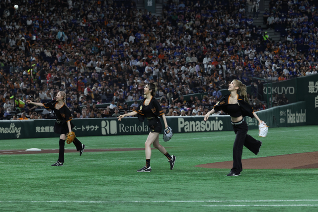 その後の始球式では3人が並んでマウンドに登場し、揃ってホームへ投球。ジャイアンツの公式マスコット、ジャビットファミリーがワンバウンドでキャッチを行った。メンバーは笑顔でジャビットファミリーとハイタッチやハグを交わし、終始和かなムードで球場を後に。また5、7回イニング間イベントの「TYO ダンスタイム」と「闘魂こめて」にも登場し、ジャイアンツ公式キャラクターのヴィーナスやジャビットとともに、公式グッズやペンライトを使って球場を盛り上げた。