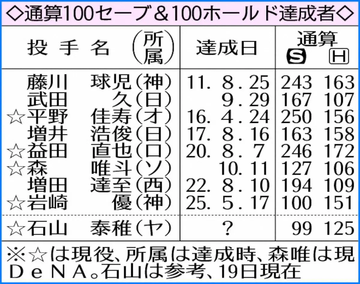 石山は現在36歳8カ月で、プロ入り以来の登板数は542試合。この年齢で100セーブ目を挙げると93年大野豊(広)の37歳7カ月、同年の郭源治(中)の36歳10カ月に次ぐ3番目の年長達成。到達ペースは81年江夏豊(日=668試合)、85年山本和行(神=571試合)、前出の大野(564試合)、92年鹿取義隆(西=557試合)に次ぐスロー5位の記録が濃厚だ。