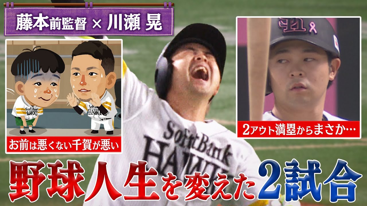 [音楽] フォークス全監督辻本浩が選手の本音に迫る。辻本さ。 [音楽] はい。いらっしゃい。 さあ、今回の藤本艇のお客様は川瀬ヒ選手です。 よろしくお願いします。 よろしくお願いします。お願いします。 相変わらず可愛い笑顔ですね。 ありがとうございます。はい。 今回のお客様は先日さよならタイムリーを放つなど講に渡って大活躍。 [音楽] 今やチームに欠かせない川瀬ヒ選手。 [音楽] 皆さんやりました。その相苦しい笑顔から漫画のキャラクターであるぽちゃんの相性でも親しまれています。 [拍手] [音楽] 藤本さんと川選手はですね、ま、ちょっと、ま、すれ違いのフォークス人生と言いますか、藤本さんが、えっと、 2 軍打劇高チの時に選手は主にこう3 軍にいたんですよね。で、 絡んだのは藤本監督の2年間ですよね。 はい。 この時のあのお互いの印象を聞きたいですよ。 初めて、え、一軍上がった時は藤本さんバッティングチで [音楽] すごくなんかこうのびノびやらしてもらったっていうのは印象でもうあの見た目言ってあれなんですけど見た目にいいすよ。 見た目怖いな。 いやいや怖い印象はもちろんあったんですけどほとその時に すごくなんか声をかけてくださって うん。 一軍の初めての舞台でのびノび出やらさせてもらったなっていうのはすごく印象的で、あとは本当に藤本さんがあの監督になさった時にはそっから自分のなんて言うんですかね?プライ生活が始まったって言っても過言ではないというか [音楽] はい。 ですごくあの試合数も出さしてもらいましたしすごくいろんな経験がさしてもらったなってのはすごく印象的ですね。 [音楽] 川瀬選手といえば粘りのバッティング 。この場面では初球から7球連続ファール と粘っ [音楽] [拍手] て8球目を見事。これぞヒカルの新調です 。すごいなんか気持ちが伝わるっていうか なんか粘る印象があるんですよ。 他の選手にないそのなんて言うんですか?自分にしかないものだと自分は思ってそれが強みだと思ってやってるので はい。こういう選手が必要なんですよ。 いやいやいやみんながみんなさ感になってもらったら打線にならないじゃん。 そうですね。 ねここちゃんなんかはどちらかと言うとその粘って玉数投げさせる うん。でいいとこで打てる。 相手ピッチャーからすればすごい嫌らしい選手。 うん。ね。こういう選手が絶対必要。 ありがとうございます。 も全部言ってくれました。もう全部行ってくれ。選手万顔面の意味でした。 今のいい映画い映画をしました。野球をよく知ってんの? あ、そういうことなん。 野球感がすごくいい。へえ。 こういう選手は絶対い。 いい笑顔してますよ。 もう終わっていいすね。まだいだ。 ここで藤本さん厳選か瀬選手の野球人生を変えた 2試合をピックアップ。 [音楽] まずはですね、見ていただきたいのは 2020年8月11 日バファローラズ戦覚えてますか? あ、もちろん覚えてます。 そうですね。これは覚えてるでしょう。 セカンドでスタメ出場したこの試合先発はエース戦画投手 [音楽] セカンド行った。あ、あ、1つ目のエラー 1 つ目言っちゃった。1 つ目って言っちゃった。もう1個すぐや。 今月、ゲツ。おい、ゲツ。ああ、だ、ここで 2つ目のエラーをしてしまうんです。 さらにこの後1 発が出れば逆転のピンチでバッターはT [音楽] 岡田選手。まさかまさかの満塁ホームラン。川選手のエラーがきっかけで 5点差をひっくり返されてしまいます。 この時どんな心境やったんですか? いや、今はもうね、笑って引きなんか言われてですけど、もう当時はもうそんなどこじゃなかったすね。 [音楽] しかしこのピンチを頼れる兄貴が救います。再びをひっくり返す逆転 3 ラン。川瀬選手も胸を撫で下ろす一発にお立ち台ではあの名言も飛び出しました。 [音楽] いや、もうお前は悪くないと。はい。戦画 が悪いんだとそういう風に言いましたし、 ま、本当明日からもね、気持ち、気持ち よく野球やってもらいたいんで、ま、そう いう意味でも打ててよかったです 。かっこいい。あの、2つ目を選んの後、 こうして、こうしてた ん吹いてました。うん。え、やべえと思っ て。あ、自分で感じです。もう、あ、でも そんな感じです。 エラーを覚えてるんですけど、その後の表情とか全く覚えてないです。 あ、本当ですか? あのね、選手ってね、偉いさ点入ったらね、すっごいね、 嫌なんですよ。だから2 つ偉らいですね。その後ホームラン打たれたらそらもう引きずるでしょ。引きずります。 それをね、消してくれたのがやだきたいからね。 そうですね。あ、なんて改めてその柳田選手がお話ししたりとかそういう機、 あの、ロッカーではい。 もう大きい声でお前悪くないよって言ってガさんに聞こえるようにで僕は戦さんにずっと謝るで戦はなんか言ってたんですか? [音楽] [笑い] いや全然大丈夫よって。はい。 月の偉いした時全然大丈夫じゃない顔してましたよ。生活投手はうわみたいな顔してました。 