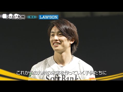 ファイト九州。今回ファイト九州のアンバサダーということで自分と選手に はい。 え、インタビューさせていただきます。よろしくお願いします。 お願いします。 出身はね、あの群馬 だと思うんですけどもはい。 え、熊本県についてはい。 はい。ちょっとお話を 伺いたいなと思って。ま、熊本県のイメージというか 温泉行きます。よく黒川温泉に行かれる。 去年か昨年ぐらいに1 回行って家族に行って はい。 めちゃくちゃ良かったイメージがあります。 ま、今回あのファイト九州のソフトパンホークス、ま、 20 周年ということで、ま、シト選手の20 年前はい。 ちょっと思い出してみてください。はい。 9歳。9歳すね。 もう野球少年、もう野球始めてる。2 年生で野球始めたんで多分ちょうど野球が楽しいと思ってるぐらいの頃だと思います。だから友達とよく野球もやってましたし うん。 ま、本当に今ほどこうなんて言うんですか?インターネットが普及してなかったんで、ま、外で遊んでましたよ、ずっと。 [音楽] で、もうそうで遊ぶのも結構野球が多かった。 野球がはい。多かったです。はい。 ま、20 周年の企画っていうことで、ま、コンセプトがワクワク 全力っていうことなんですけどはい。 なんか最近ワクワクしたことってワクワクしたこと最近すか?最近じゃなくても例えば子供の頃でもいい。 あの遠足とかめちゃくちゃワクワクしてました。私学旅行とか。 ま、ファイト九州の今プロジェクトが九州の子供たちに 元気を届けるという役割があるんですけども、 ま、都選手の元気の皆源っていうのがあればちょっと教えて欲しいんですけど、好きなことを今できてるっていう [音楽] みんなでこの一軍で野球できてるっていうのが 1番かなと思います。 野球の全てがもう自分の元気の見なことだと思う。 そうですね。はい。 素晴らしいじゃないですか。ありがとうございます。 え、ま、これからの九州の未来をね、作っていく子供たちに、 ま、東選手 からね、子供たちに見せたいプレイをちょっとしに書いてもらいたいんですけどはい。熊本のね、ホークスコ、そして九州の子供たち、 [音楽] 九州の子供たちです。 こんなプレイを見せたいとおし。 ではお願いします。 はい。この見せたいプレイは、え、ホームランです。 みんななんか盗塁とか足の速さっていうのはもうそろそろ見飽きてきたんじゃないかなと思って今年は入手としてホームランをやっぱみんなに届けたいす。 [音楽] いや、今年体は大きくなりましたもんね。 大きくはい。なりました ね。やっぱり体を大きくした理由っていうのもなんか [音楽] 距離を伸ばしたいとかじゃなくてこう長くやっぱ野球を続けてにあたってちょっと今のままだと絶対また怪我してはい。 和田さん見たく40 歳までやるためにはこう体を鍛えないといけないと思ったんですね。やっぱね、この走れるシュートプラス打てるシュートに変わっていかないといけないのかなと思。 では最後に熊本県のホークスワンの皆さんにはい、メッセージをお願いします。 はい。 え、熊本県のホークスワンの皆様、え、昨年ですね、僕多分人 3 本ぐらい言ってます。で、その前の年は、え、さよならでホームに帰ってきてます。熊本は僕何か起こせると思ってるので、はい。 今年もいいプレイを見せれるように、え、勝ちを届けれるよう、届けられるように頑張りたいと思います。よろしくお願いします。 じゃあ今年はそのヒットがホームランになるようにか変わってる姿をね、 入れると思うんで是非 お願いします。頑張ってください。 はい、ありがとうございます。 そして今回九州のアンマーサダーのてということで、あの子供たちに僕があの、 前期を回って元気というパワーっていうか届けに行くっていうちょっと体をあのやらせていただこうなったんで はい。 シュ東選手のパワー、元気をちょっといただきたいなと思って こちらに3位を書いていただけますか? はい。元気とパをコめて書こうか。 書いても全然大丈夫。 はい。はい。いただきます。ありがと。 ありがとうございます。本県の皆さん、北走の皆さんいただきましたんで届けに行きます。 元気1眼全 [音楽]
