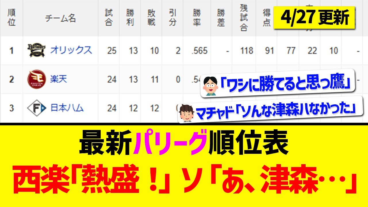 【4月27日】最新パリーグ順位表 ~西楽「熱盛!」ソ「あ、津森…」~
