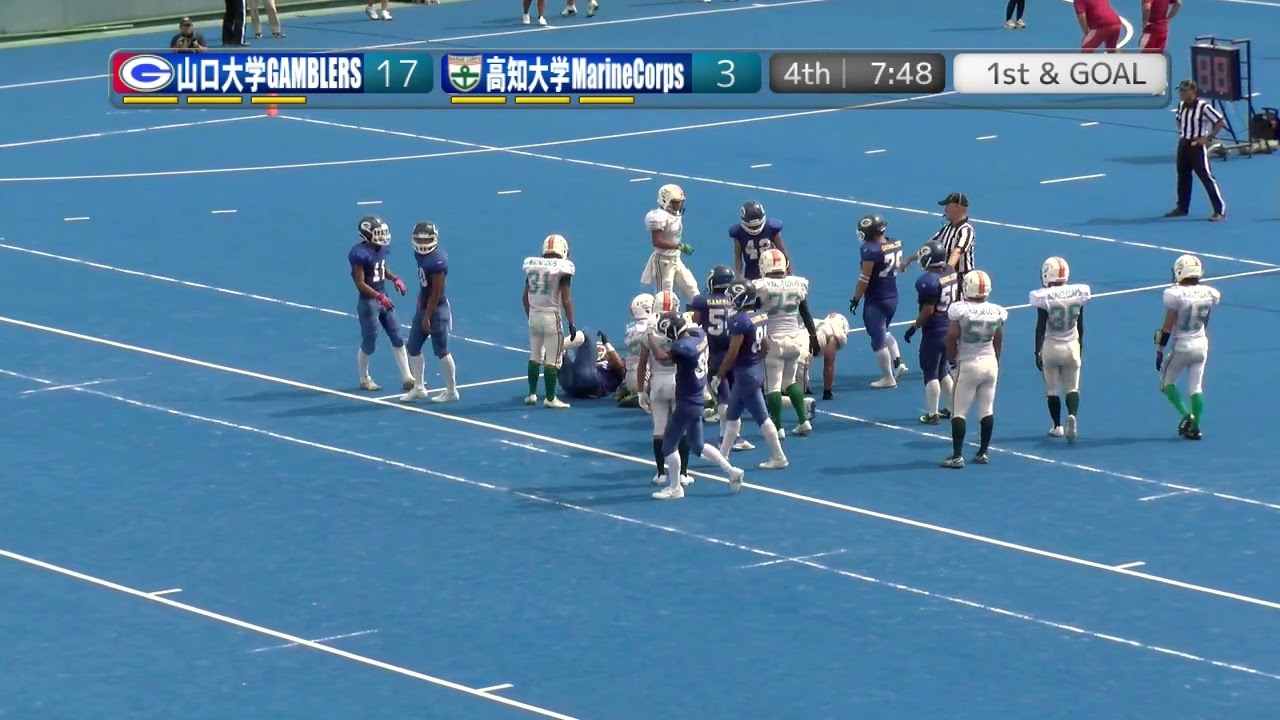 さあ双方向きを変えましてこれより ファイナルクォーター第4クォーターに 入り ます山口大学自陣11ヤドからのセカンド ダウン4で試合再開となります [音楽] [拍手] 功ここで山口再び外にいましたレシーバー にパスをじましたターゲットは10番でし たがこのパスが低く過ぎパス不成功に 終わっています結果ダウンがそのまま 変わりましてサーダウンに変わり [音楽] ます大学 ダウ 残りさあ山口大学サダン4 [音楽] [拍手] フス成功 ファスここで山口大学中央に切れ込んだ レシーバーにパスを投じました1終点に 入り込んだ98番相手ディフェンス犬見本 にキャッチしまして攻撃点更新です山口 大学ファーストダンここで山口山口大学は 99番を使用しましたキました99 山口高校出身3回 [音楽] です山口大学自陣25ヤからの攻撃 ファースト点に変わり [音楽] ますさあ今度は外へ振りますに展してに そこから10番がキャッチアラン決めまし て約5ydから6の原に変えています山口 大学はこの短い横へ展開するパスプレイに よって徐々に状況有利火炎と現在攻撃を 展開している模様ですその軸になってるの は山口大学10番の木下です池田高校出身 のプレイヤー [音楽] です山口大学セカンドダウン5 [音楽] [拍手] 今度はその10番にハド左オープン点が 測りまして10番そこからカットインし ました攻撃更新です山口大学 ファスタはランによって攻撃拳更新いたし ました10番の木下のランプレイ [音楽] ですさあこれによりボール音は陣 4038に変わりました山口大学 ファーストウン [拍手] 10パス不成功今度は1点奥に走り込んだ 42番にパスしかしこれは高大学も31番 見事にカバーしパス成功に変えております ダン1つ変わりまし [音楽] [音楽] 山口大学陣38アからセカンド転 [拍手] [音楽] [拍手] 前 てるここでサイドしかし ビフここで大きなプレが出まし たにターバック流れてそから奥に走り込ん だシバー99番にパス9 まし残念ながらサイドラりましたが相手 13まで前進してのファーストウン です見事に全身を更新成功したのは99番 のウンでした山口高校出身3回 戦さあ山口対相手陣13Yからの ファースト アウプレを選択しまし た今度はパワープレイで出ましたラニ バックにボールを持たせましてレシーバー 選手固めての中央のランプレーづくで約8 ヤ近い原因を奪っております たデリータイムアウトがれてい ます1枚 [音楽] アウト中が1 枚マジでテしてよ さあレフリータイムアウト解けまして試合 再開です山口大学手人7からセカンド ラウン3 [音楽] [拍手] [音楽] パス不 成功ここでアイフォーメーションから カウンターフェイクでフルバック14番に パスを投じましたしかしこのパス見れまし てパス不成功ですサダンに変わり [音楽] ます山口大学サーラウス この3ヤードの攻防注目 [音楽] ですさあクイックハルのプ見事決まりまし て攻撃更新山口 [拍手] ファスタここで直前までハドルを解かず その終了間際にプレイしまして相手の守備 の混乱つきまして見事攻撃拳更新です山口 学素晴らしい判断で攻撃更新になりました 14番の中山のラウンドでしたさあこれで 山口大学は相手陣4ヤドからファースト ダウン2ゴールに入り [音楽] [拍手] [音楽] ますここでフのランプレイタッチ [拍手] ここでさらにダブ重ねたフルバック14番 そのボールを受け取りましてそのま密終点 に突しエンドゾーンに体を込んで [拍手] 立ここでタッチダウン重ねました山口大学 14番の中山でした広島情報高校出身3回 ですそしてトライ4ポイントに入ります キック決まりまして1点追加山口大学24 点高大学3点とその得点差広がっており ます [音楽] [音楽] 現在通信環境が不安定なためか若干駒落ち の状態が続いておりますが何卒ご了承 よろしくお願いいたし [拍手] ますさあ山口大学着々とタッチダウン重ね ましてその差を広げていっております甲 大学なんとしてもこれを覆さんとここから リターンで攻撃の展開を図ります [音楽] [拍手] さあこはリターに 入る右オープンつきまして38や付近から の攻撃を得ます [音楽] [拍手] プレ [音楽] プレファ高知大学自陣38ydから ファーストダウン10 [拍手] まし [音楽] やナイスキャッチ ファスタここで高パスプレイによってまず 最初のプレー見事ファーストラン更新と なっております右に展開した11番逆 リードのパスながらこれを見事にキャッチ そこからサイドライン駆け上りまして攻撃 園更新です高知高知大学ファストラン見事 のキャッチアンドラ決めたは11番の谷林 姫路西高校出身の2回戦です [音楽] [拍手] 大学 ファ高知大学ファーストダウン 10パス 功再びパスプレイ今度は3番がターゲット しかしオーバースローパス成功でセカンド ダウンに変ります [音楽] [拍手] [音楽] 高知大学セカンド [音楽] 運転ここでドロープレイパス見かけてラン プレによって突破測りましたがしかしこれ は山口備れていました1ヤードの原因で とまっておりますさーダウンに変わります [音楽] [拍手] [音楽] [拍手] [音楽] 高知大学 [音楽] サダンパス 功パスにトプ