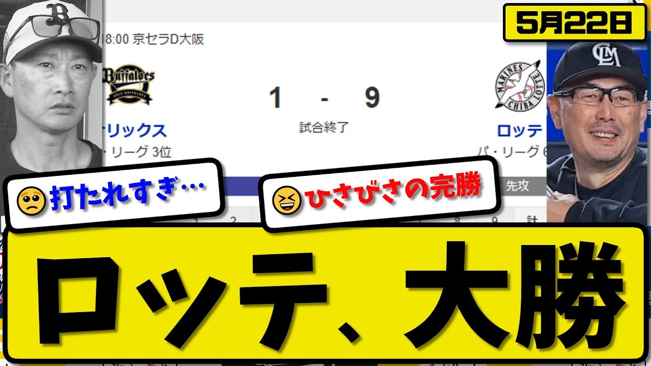 【3位vs6位】ロッテマリーンズがオリックスバファローズに9-1で勝利…5月22日大勝…先発横山5回無失点…池田&茶谷&藤原が活躍【最新・反応集・なんJ・2ch】プロ野球