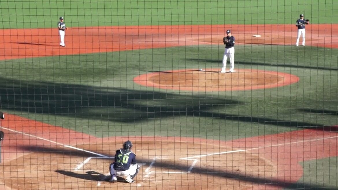 7回裏 嘉手苅浩太投手がマウンドへ投球練習を始める。