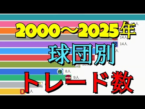 トレード発表翌日には各スタメン出場した読入りジャイアンツ砂川リチャード選手。 一方ソフトバンクに移籍した秋優ト選手も先日の試合は一ベンチ入りするなどまさに緊急トレードとなりました。そこで各球団が 2000 年以降トレードで獲得した選手の数を調べてみました。 AからDそれぞれに当てはまる球団はどれ でしょう?野球腕クイズでは野球に まつある様々なクイズ動画を作成してい ます。気に入っていただけましたら高評価 、チャンネル登録よろしくお願いします。 まずはヒントなしの状態で見ていき ましょう。あなたはどの時点で分かります か ?今回対象とするのは交換トレード、金銭 トレード、保障トレードで獲得した人数 です。放出した人数は含まれていません。 ສ ここからはヒントを頼りにもう一度見て いきましょう。 球団Aは現在消滅してしまった近鉄につい で2番目にレートでの選手は1球団でした 。 球団Bは球団Aや近鉄中日とのトレードが 多いですね。 この頃の球団Aはカリーグ相手のトレード が多いですね 。集団Bは2007年に7人、2010年 に6人、2011年に7人、2013年に も6人の選手をトレードで獲得しています 。この頃の球団C、球団Aや関東県の チームとのトレードが多いですね。 2008年の球団D珍しく3人トレードで 獲得しました 。育成制度が始まった2005年頃から トレードの件数は激減しています。 この頃の球団B、球団A及びセリーブとの トレードが多いです 。球団Cは14年に3人、17年に4人、 19年に4人獲得しています。 あ。 H球団Cは2021年に4人、2023年 には7人獲得しています 。球団Dは収支トレード件数が少なかった ですね 。それでは答えです。まずは収支トレード の件数が少なかった球団D。こちらは広島 東洋カープでした。 続いて近年トレグの件数がとても多い球団 C。こちらは北海道日本ハムファイターズ です。2010年頃にフレードの件数が 休増した球団 Bオリックスでした 。最後に2000年代前半トレードの数が 非常に多かったのは阪神タイガースでした 。答えが分かったところで改めてグラフの 動きを見ていきましょう。 ご視聴ありがとうございました。あなたの 予想とギャップはありましたでしょうか? 是非感想を聞かせてください。 野球でクイズではクイズテーマを募集して います。是非コメント欄でリクエストして くださいね。