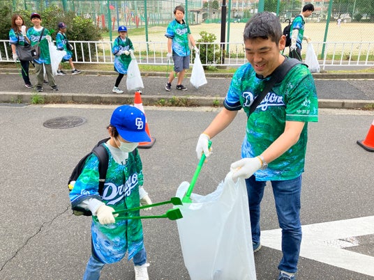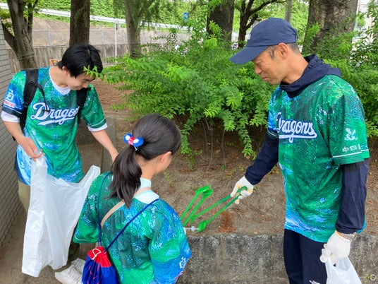 川又さんや英智さん、荒木さんは参加者と一緒にゴミ拾いを行いながら、積極的に子どもたちと交流。川又さんは「こんなにみんなで頑張っていいことしてるんだから、今日はドラゴンズにも勝ってもらいたいね!」と子どもたちにに声をかけると、子どもたちは満面の笑みで「応援も頑張ります」と元気よく返事をしながら楽しそうに清掃を続けました。