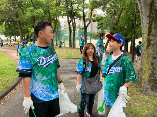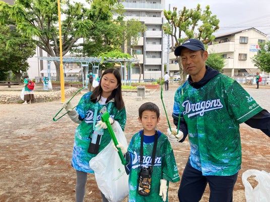 川又さんや英智さん、荒木さんは参加者と一緒にゴミ拾いを行いながら、積極的に子どもたちと交流。川又さんは「こんなにみんなで頑張っていいことしてるんだから、今日はドラゴンズにも勝ってもらいたいね!」と子どもたちにに声をかけると、子どもたちは満面の笑みで「応援も頑張ります」と元気よく返事をしながら楽しそうに清掃を続けました。