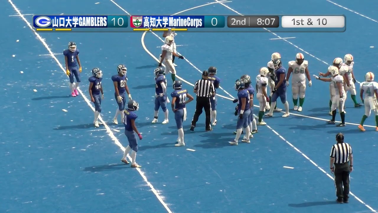 さあ甲子の方向変わりましてこれより第2 クォーターに入ります甲子大学フォース ダンラここはパントによって陣地挽回測り ますこのは山口大学31近まし となります攻撃は変わりましてテク オーバー山口大学に変わり ます福岡様メッセージありがとうござい ます今のところはライン戦は山口大学は 優勢な考えしますと山口大学の選手の動き た動きが良いように感じます頑張れ ギャンブラのメッセージありがとうござい ますライン戦というのは最前列にあります ボールを持たない主に持たない選手の5人 のことをさしますこの講師の工合が非常に 重要ですがここは今山口大学有利だという 判断をされてるようですさあその有利な 攻撃を展開する山口大学が自陣28ヤから の攻撃ファースト ダウンこれは高ナイス ディフェンスさあその優位な地上戦によっ てまずラキャリア11番の総力に託しまし たがここで高知大学素晴らしい ディフェンス陣の動きがありましたこの ランプレーボールを持った選手がトアナ ディフェンスが殺しまして46番見事 仕留めまして3ヤードロスに変えています アメリカンフットボールは全をイ交代を ロスを表現します見事ロスタックを決め ましたのは高知大学46番のホタですえ堀 と読ませていただきましょう下館第1高校 出身の1回戦 ですさあセカンドダウン13の 状況今度は左オープン展開しまし たレシーバーのブロックをてオン 7を果して [音楽] ますここで託されましたのは10番の木下 でした池田高校出身のプレイヤー [拍手] です山口大学サダフ [拍手] [拍手] [音楽] ナイスファース ダン山口大学クォーターバック14番ここ でパスを閉じようとしましたしかしこの パスをじる時にディフェンス陣が殺しパス の投げるタイミングを失いませましたが しかしクォーターバックここで緊急発信の ランプレイに切り替えましてこの判断見事 に走し撃更新です山口大学ファス 素晴らしい判断しました山口大学 山でした広島高校出身の3回 です山口大学ファーストダウン 10さあ今度は中央へのランプレー今度は キャリア10番に託しています託されまし た10番そのまま点トップりまして約6 から7のとなっていますランを観しました のはえランニング枠の4番えランニング枠 の10番の下した池田高校出身の プレイヤー です山口大学セカンドダウ487 これは高がナイスディフェンス今度は外へ 振りました横に展開したレシーバーに ヒッチパス当時そこからキャッチアンドラ 計というところでしたがこれは甲子大学 ディフェンス人22番見事に対応しまして このプレイをロスに変えており ます今度は高知大学22番が見せました 素晴らしいプレイでしたえ番号の方すい ませんこちらの方の登録にあります番号で は確認できておりませんので後ほどそちら の方確認できましたらご案内させて いただこうと思います [音楽] さあサーダン [拍手] 6パス功ナイスパス カットここは素晴らしいディフェンスを 高知大が見せました山口大学これをパスに よって突破測らんというところでしたが ここで高知大学がキャッチするはタックし ましてこのキャッチそのを破壊しまして プレイを終了させております 見事そのディフェンスを見せましたのは 高知大学31番の山崎でした高知学高校 出身え高知学園高校出身の3回戦 です現在負傷者が発生してるためレフリー タイムアウトは取られております [音楽] いいぞ [音楽] さあレフリータイマと解けましてこれより 試合再開となります山口大学フォース ダウン6パントフォーメーションを取り [音楽] [音楽] ます サイドラに蹴りしましたリターンできない 絶妙の空時間を利用しまして大学20付近 で外に出ましてこの位置での甲交代となり ますここは山口大学のパンター7番の山根 が見せました福岡高校出身の2回戦です 高校時代はラグビーラグビーの経験者でし たさしかし撃はに変りました学 [拍手] [音楽] さあここでドロープレイに来ましたカス 見せかけたランプレードロープレイ相手の 衣をつくようにキャリア6番が中央を 切り込みまして約6ydの原因としてい ますまず最初にたさましたラウンを決め ましたのは6番の井でし た島原高校出身の2回戦まず最初の役を 果たしており ます高知高校高知大学セカンドン 4今度は山口隊ディフェンスが踏ん張り ます今度は外へ踏みました枠6番にトスを しまして右オープンへのランを展開し スピードによって相手を一面というところ でしたがこれをしかし山口大学 ディフェンス2が殺最終44番がめこのダ を阻止しております44番は山本ですえ 山口高校出身の2回戦がここでプレイを 決めており ますさあ高知大学サーダウン6 [拍手] ここでトラブル発生もっとろもっとろ スナップを受けようとクォーターバック 18番えみましてそのままスさんにボール を確保し切れずファンブルしましたなんと かそれをフォローしましてボールは抑えて おりますがしかし大きく交代しまして フォースダウンに変わり ます高知大学フォースダウン16パント フォーメーショ