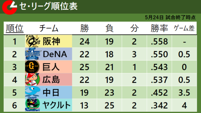 【セ・リーグ順位表】8回に勝ち越しを決めた中日と巨人がそれぞれ勝利 4連勝の巨人は3位浮上|日テレNEWS NNN 日テレNEWS NNN【セ・リーグ順位表】8回に勝ち越しを決めた中日と巨人がそれぞれ勝利 4連勝の巨人は3位浮上(日テレNEWS NNN) Yahoo!ニュース阪神・工藤泰成(インディゴ)、救援で2失点 苦しい中継ぎ事情浮き彫り 徳島新聞デジタル中日・高橋周平、”打撃の師匠”も殊勲打喜ぶ「フォームも大きくて堂々」兄・恭平さんの40歳の誕生日にうれしいプレゼント 中日新聞Web中5―4神 高橋周の2点適時打で勝ち越し 阪神は3番手で登板の工藤崩れる 産経ニュース