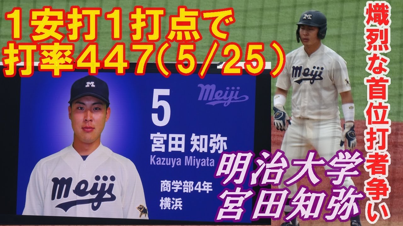 宮田選手は4打数1安打1打点の成績で5/25時点の打率が447となり立大・山形に3厘差つけて目下首位打者をキープしています。明治は明日5/26にも試合がありますがどうなることやら‥‥。首位打者を獲らすための欠場は辞めてくださいね(笑)。