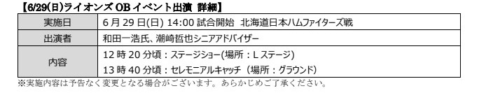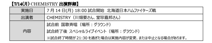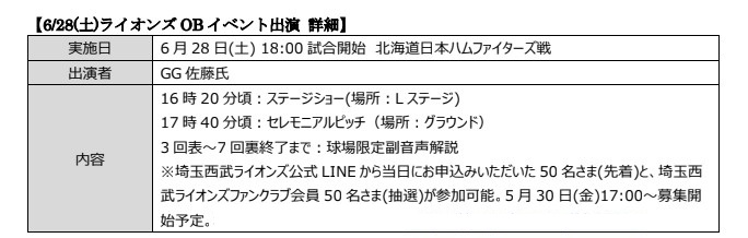 7月14日(月)の試合では、ヴォーカルデュオ「CHEMISTRY」が、試合前の国歌斉唱と試合後のスペシャルライブに出演することが決定。さらに、6月28日(土)にはライオンズOBのGG佐藤氏が来場、29日(日)には和田一浩氏をが球団本部シニアアドバイザーの潮崎哲也氏と共にトークショーに出演します。