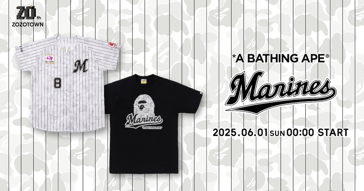 「ゾゾタウン(ZOZOTOWN)」は、「ゾゾタウン」の20周年と千葉ロッテマリーンズとの冠協賛試合を記念して、千葉ロッテマリーンズと「ア ベイシング エイプ®(A BATHING APE®)」がコラボレーションした限定アイテムを受注販売する。受注販売期間は6月1日0時〜15日23時59分で「ゾゾタウン」で受け付ける。価格は、1980円〜。