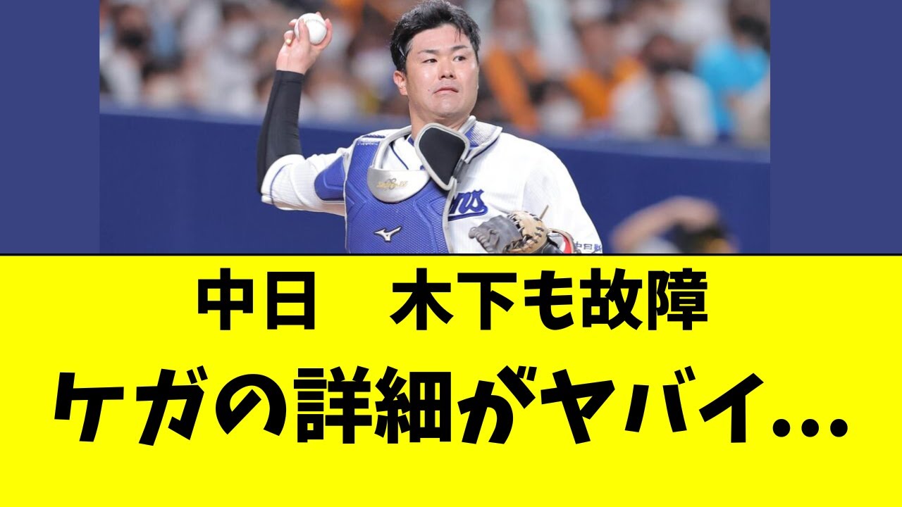 中日ドラゴンズの木下拓也選手も故障と なってしまいました。故障の詳細がかなり やばいということで見ていきたいと思い ます 。今年は西保守に帰りざいた木下選手。昨 シーズンはオープン戦の不調のまま4月 まで1割台。そして5月以降打率は戻って きたんですけれども魅力の長打力が影を 仕留めるというシーズンになりました。 そして年齢の影響もあるのか、盗塁素率も ほぼ1割ぐらいと、ま、ほぼほぼさせない ぐらいの数字になってしまいました。ただ 今年は盗塁素止率が2割3分ほどとなって おりまして、もちろんいい数字ではないと はいえ、ある程度は数値が戻ってきてい ました。そして打撃成績で見ても38試合 で2割4部1輪、ホームランが2本、打点 が8つ、出塁率が2割区部2輪、OPSが 613という成績になっています。打撃 成績も、ま、全体的にこう打点の状況、ま 、ピッチャーの方がこう成績が出やすい この状況化においては、ま、キャッチャー というポジションも考えると最低限の打撃 成績はクリアしているかなというような そんな数値が残っていました。ま、そして 、ま、チームの防御率っていうところも 決して悪くないですし、その投手人を 引っ張っていたキャッチャの木選手なん ですけれども、5月の30日の総塁中に 故障で登録マシということになってしまい ました。そんな木選手の故障の詳細が判明 したということで詳しく見ていきたいと 思います 。井上監督が木下選手の故障に関して コメントです。左ハムストリング太もです ね。ここの損傷となりました。そして井上 監督は俺の見立て医者じゃないからな。で も確実に1ヶ月は無理だろうねとは思い ます。で、交流戦の時に木の下がもう再 登録ってことはまずないでしょう。なので 7月のオールスター前ぐらいに復帰して くれればなっていう。これは俺の願望です よ。分からないですけどね。どんなもんか 。超人的な回復力で回復してくれればそれ はいいですけどもとこんなコメントになっ ています。つまり7月の中旬から下旬に かけて復活してくれれば十分というぐらい でむしろそれよりも後ろになってしまう 可能性もあるとそれぐらいのコメントに なっています。なので、ま、7月の下旬頃 まではなんとかこう宇選手とあったり石井 選手とか、ま、この辺りでなんとかこう キャッチャー回していくという感じになっ ていきそうです。田中也選手であったり 村松選手がなんとか復帰してきたんです けれども、福永選手が再び故障で離脱で、 ま、長期離脱となりそうと骨折となって しまいました。他にも細川選手であったり 、柳選手、ま、斎藤投手、中田翔選手、ま 、またあとはウォルターズ投手と、ま、 本当に今年はですね、故障者が多くなって しまっています。その後に木下選手も、ま 、故障で離脱ということになってしまった わけですからね。相当苦しい状況化では ありますけれども、なんとかAクラス入り 目指して頑張って欲しいと思います。是非 チャンネル登録、グッドボタンお願いし ます。ご視聴ありがとうございました。