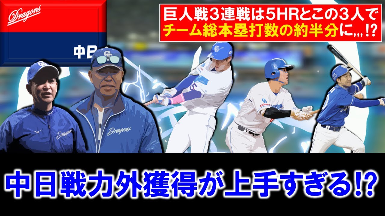 はい、プレイボール、どうもキちんです。 中日戦力獲得がうますぎるということで ございまして、はい、ま、今回は中のね、 お話しでございます。ま、巨人との3連戦 初めのね、2つを落として雰囲気は良く なかったんですが、ま、最後ね、しっかり と勝って3打ては阻止で、その中で非常に 活躍していたのが上林、伊山、山本。昨 シーズンね、占領で獲得して2年目のこの 3人でございます。ま、去年もね、ある 程度1軍では出ていたんですけど、ま、 今シーズンもしっかりと上で出てくれて おりますし、で、特にホームランンって いうとこではありますよね。ま、そこで見 ていくと、ま、なんとね、チーム本塁打数 の半分近くをね、この3人で閉めていると いうところもありますんで、ま、その辺も 含めね、お話していきたいと思います。ま 、ではまずね、この選手から見ていき ましょう 。はい。まず1人目はウェバ選手プロ12 年目出身は埼玉1995年8月1日まで 29歳。184cm84kmガイア右投げ 左打ち2013年ドラフト4名の選手今後 の年は1750万円ソフトバンク試合は4 年目にレギュラーを掴み規定にも到達 さらに翌年は143試に勝しダ2部22 ホーマーとケレの設置を記録しかし ストレコは毛止まりてめ2022年は開幕 から復調を見せておりましたが5月に アレスダシーズン終了復帰後も結果を残せ ず奥に占領が足り順が獲得そしてさっきは 1軍で46試合で打率1割と結果を残せ ませんでしたが今期はオープ戦で結果を 残し開幕となっていたというとこでござい ます。はい。まずは上選手。ま、通算ね、 順に移籍してくる前。ソフトバンク試合は 602試合で2割4分2輪。1700打数 で412アダ57フォーマーオプセ.74 とま、早い段階からレギュラーを掴んでい たんですけどなかなかね近年は成績を残せ ず年占領がなって入りで中日1年目はです ね1軍で46試合1キューブ1輪94打数 ジアジャンダ一番オプセレ点503とま あまりね活躍はできなかったんですがま それでも2軍ではそこそこ打っていたって ところもありましたしまもいけ るっていうところもあったんで契約は更新 中日地で2年目のシーズンを迎えていた わけでございます。で、オープン戦では 15試合で3割部1輪41+14アンダー 3フォーマーオペスレ点951とオープン 戦でね、かなりこう打っておりまして、 非常にこう期待値が高まる中開幕してから もですね、1軍戦では38位似合い力部6 リ124数で33ホーマス0.738と いう成績になっております。はい。ま、 ここまでね、しっかりと成績を残しており まして、OPSは0.7台で守備も しっかりとこうこなしているというところ はありますんで、もう完全にレギュラーに 定着。ト番バング試合のいい時のウェバー 選手が帰ってきたというとこではあります 。で、この5フォーマーっていうのはです ね、チームのホームランス1位というとこ になっておりまして、ま、細川選手が不調 や怪我もありましていない福永選手も怪我 と一発が打てる選手がね、少ない中で本当 にこういいところで打ってくれております し、ま、先日の巨人戦でも2本ね、打って いたっていうところもありますんで、ま、 そういうところを考えると彼がいなかっ たらちょっとどうなっていただろうなと いうところはありましたんで、ま、本当 獲得してね、良かったっていうところは ありまし、ま、去年リリースしなくて 良かったなというところでありますよね。 はい、ではついて見ていきましょう。 はい、続いて山本選手プロ10年目出身は 東京都1993年10月31歳136cm 74kmポジションはショ頭セカンド サードファスト内ア全番守る右投げ右打ち 2015年ドラフト5名最初は巨人2入団 攻撃の年法が2000万円巨人は1試目 から27年生翌年以降も上に消費を増やし 4年目の2019年には92社に出場 しかし5年目は怪我って一軍のなしに 終わるとおや金銭トレード遺跡1年目は 遊びがため中心も2年目は朝面でもきよ しかし昨年は2軍での調整がついて大に 先外その後11月に順試合に入団すること が発表そして昨年は79者に勝し今期も 開幕1軍スタートとなっていたというとこ でございます。はい。この山本選手、ま、 巨人阪神でプレイしておりまして、遺跡前 は通算341試合、25輪、647で 152アンダーオペス0.625と、ま、 まずね、試合に出ていた選手でございまし て、ま、特に阪神では矢野政権自体にね、 使われていたってところもあったんですが 、ただ、ま、岡田監督に変わってグっとね 、出番が減って順地に移籍。で、昨年は ですね、1軍で79試合2部、156打数 34台マオセル601と、ま、昨シーズン は内アのね、サブとして80試合近くに 出場、ま、打率も2割5部でございますし 、しっかりと活躍してくれておりました。 で、今シーズンはオープン戦で2割部2輪 、9打数2でオベス0.44と、ま、 オープン戦ではそこまで活躍できそうと いうところもあったんですが、ま、ただ 福永選手、田中選手が怪我っていうところ で、ま、開幕がね、1軍でございました。 で、一軍見ていくと30試合で2部3人 73打数17ホマポペセレ586という設 
