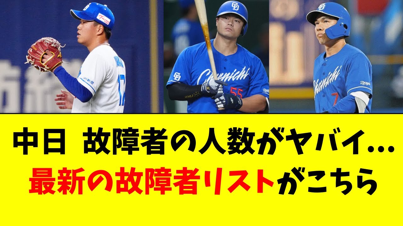 中ドラゴンズの故障者の人数が今年は かなりまずいことになっています。最新の 故障者リスト改めて見ていきましょう 。まずは先発投手人から梅滅投手がですね 、ずっと1軍でも2軍でも登板がありませ ん。元々今年は規定投球会を井上監督から 期待されていたんですけれども、 コンディション不良ということで2軍 キャンプスタートとなりました。そして ですね、ま、ずっと報道がなかったんです けれども、4月の中旬にようやく、ま、 強い出力で40mぐらいキャッチボール できるようになったと、ま、そんな報道が あって、そろそろ復活かなという風に思わ れたんですけれども、そっからまたですね 、1ヶ月半ほど報道がないという状況が 続いています。ま、詳細が分からないん ですけれども、ま、年齢的にもそろそろ ですね、こう2軍で、ま、戻ってきて今年 中に1軍昇格というところ見たいなという 風に思います。そして草投手ドミージョン 手術で、ま、ほ々ドラフト1で入ってきた んですけれども、昨シーズンは1年間、ま 、全く投げることができませんでした。 ただ今年ようやく復活しまして2軍で3 試合登板しています。結構感覚を開け ながら最初の登板では1イニング、次が2 イニング、その次が3イニングという感じ でイニングを徐々に徐々に増やしている ような、ま、そんな状況です。イニングと 同等の三振もしっかりと取れていますし、 フォアボールも、ま、数としてはそんなに 多くないですし、全体的なまとま りっていうのがありますので、ま、こっ からですね、1軍での登板っていうのが 後半戦で、もしかすると数試合、1軍で 先発っていうのが見れるかもしれません。 そしてもう1人柳投手。4月の中旬の登板 の際に右肩の故障で交板してしまいまして 登録勝となりました。昨シーズン本当に 苦しんだ柳投手だったんですけれども、 今年はですね、防御率が0点台と脅異的な いい成績を残していただけにですね、ま、 この抹勝っていうのは痛かったです。 そして5月の中旬にシート打撃登板してい て、そっから2軍登板という流れだったん ですけれども、まだここまで2軍での実践 登板がありません。1軍での先発という ことになると7月とか夏頃までずれ込むか なと。ま、そんな状況になっています。で は続いてですね、リリーフ投手人も故障者 がかなり多いということで、こちらも見て いきます 。リリーフ投手の故障者リスト1人目が森 と投手。3月にトミージョン手術を受けた ということで、このトミージョンは大体、 ま、1年半ぐらいは復帰までかかります から、今年の登板っていうのは極めて 難しい状況です。ま、おそらく来シーズン は育成再契約ということになって復帰を 目指す可能性が高いのかなという状況です ね。ま、年齢的にもそうですし、これまで の登板数とかを見ても、ま、崖けっぷチの 状況ではありますので、なんとか育成から ですね、上がってきて欲しいと思います。 そしてもう1人がウォルターズ投手。2軍 で後頭続けていて、ま、開幕1軍には入れ なかったんですけれども、ま、上がってき てもおかしくないなというぐらいの状況 だったんですけれども、4月の下旬に脇腹 の肉となってしまいまして、離脱、ま、 しばらくですね、登板できない機会が続い ていました。ただようやく5月の末に復帰 を2軍で果たしましていきなり160km 計測しています。ま、マルテ投手も若干不 安定な部分ありますし、このまま ウォルターズ投手が2軍で後頭を続けて いくと1軍でリリーフとして戻ってくる 可能性っていうのがあるのかなという風に 思います。そしてもう1人斎藤後期投手。 防御率0点台で、ま、左のリリーフが ほとんどいない中日の中では本当に貴重な 選手なんですけれども、5月の中旬に コンディション不良で離脱ということに なってしまいました。ただ斎藤投手自身は 投げられる状態ではあったという風に語っ ていて、ま、大事にならないように、ま、 そして今、ま、コンディション不良の部分 を完知させるという意味合いで、ま、今2 軍でリハビリをしているという状況になっ ています。現状はやっぱり守って勝って いかなければいけないというチーム状況 ですから、この斎藤投手もですね、万全な 状態で早く戻ってきてくれることを期待し たいと思います。では続いて野人ですね。 野人も故障者が続質しているということで 続いて見ていきたいと思います 。内アの故障者ですけれども、まず キャッチャー木下選手。今シーズンは正放 して、ま、昨シーズン盗塁措置率が、ま、 1割前半ぐらいだったので、ま、ここが ですね、課題だったんですけれども、ここ をしっかりと、ま、ある程度のところまで 2割前半ぐらいまでは戻して、そして打撃 成績もまず、こうキャッチャーとしては、 ま、今年であれば、ま、合格点かなって 言えるぐらいの成績にまでは戻ってきてい ました。ただ5月の末に総塁に太もの負傷 で離脱となってしまいまして、井上監督 からは早
