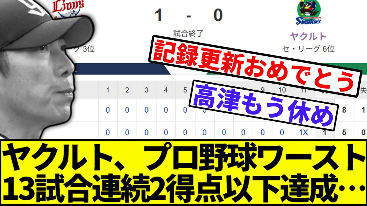 【歴史に名を刻む】ヤクルト、プロ野球ワースト13試合連続2得点以下達成…【なんJ反応】【なんG反応】【プロ野球反応集】【2chスレ】【5chスレ】【巨人】【阪神】【中日】【横浜ベイスターズ】【カープ】