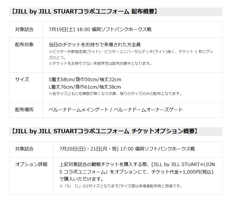 株式会社TSIが運営する「JILL by JILL STUART(ジル バイ ジル スチュアート)」は、株式会社西武ライオンズと、「JILL by JILL STUART×LIONS コラボシリーズ」として、7月19日(土)~21日(月・祝)にベルーナドームで開催する福岡ソフトバンクホークスとの3連戦にて、初日の19日(土)には、「JILL by JILL STUARTコラボユニフォーム」を来場者全員に配布するほか、20日(日)と21日(月・祝)には観戦チケットのオプションとして、税込み1,000円でコラボユニフォームを販売します。