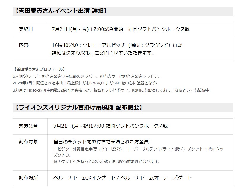 また、21日(月・祝)にはアイドルグループ「超ときめき♡宣伝部」のメンバー菅田愛貴さんがセレモニアルピッチやイニング間イベントなどに出演します。さらに同日は、「ライオンズオリジナル首掛け扇風機」を来場者全員に配布されます。