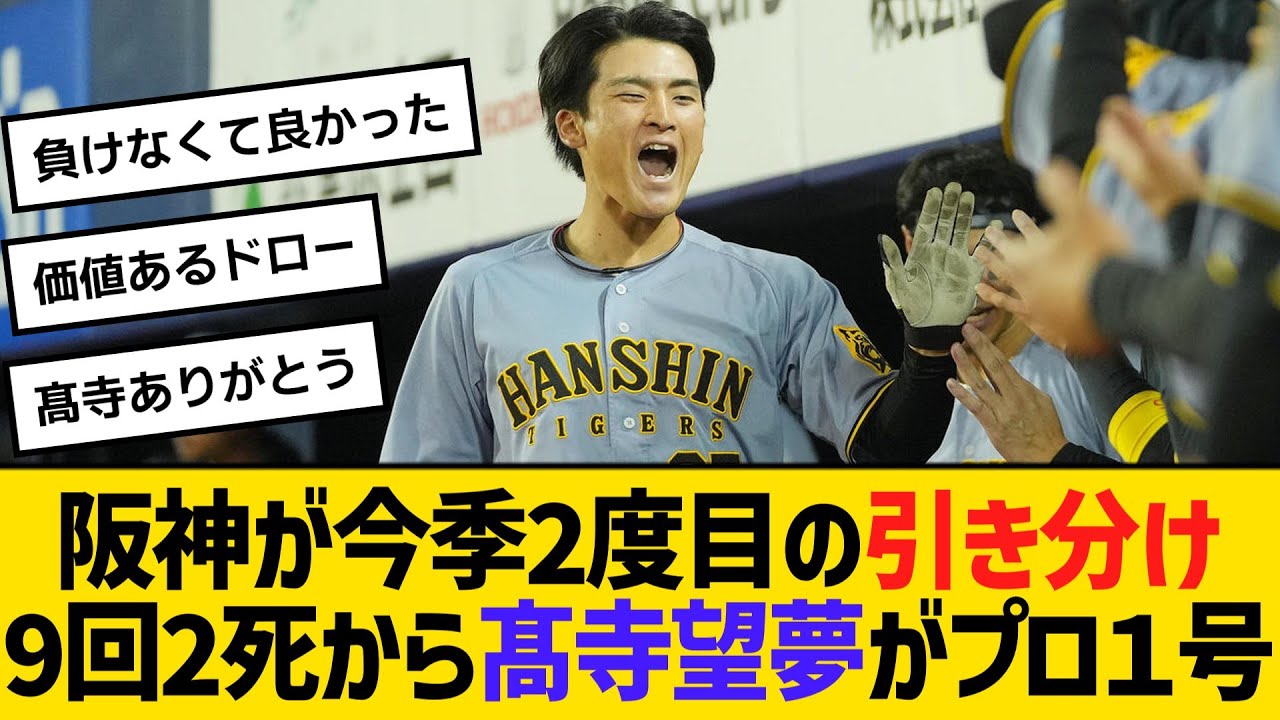 阪神が今季2度目の引き分け、9回2死から髙寺望夢が劇的プロ1号ホームランで同点 【ネットの反応】【反応集】