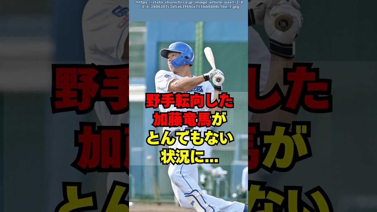 野種に転校した中日加藤龍馬がとんでも ない状況に154kmの5リリーフとして 2023年中1がドラフト6位指名24歳 で支配枠での指名1年目からの活躍が期待 されました。しかしプロ入り前から満性的 に故障を繰り返しておりプロ入り後も故障 が続いてしまいます。さらに2軍で登板し た全で支球を出してしまうコントロールに も大きな課題がありました。当時の井上2 軍監督が1年目の夏ト地点で野手電候を 提案。一軍登板なく1年目のシーズンを 終えてオフに慰例の育成再契約そして野種 転校となりました。左右両打席で作声を 連発し打球速度は大谷翔平並と話題に。 キャッチャーやスイッチヒッターなど あらゆる可能性が模索されましたが、現在 は右打ちの外野足としてプレイ。2軍では 打率が1割前半、三振率も40%を超えて おり、確実性には課題が残ります。さらに 長大や盗塁面でもアピールできておらず 守備でも大きな課題が残っています。26 歳と時間はありませんが、身体能力は とてつもない選手でこっからブレイクに 期待