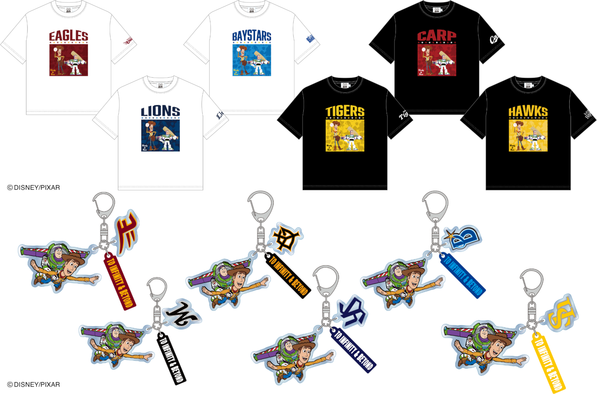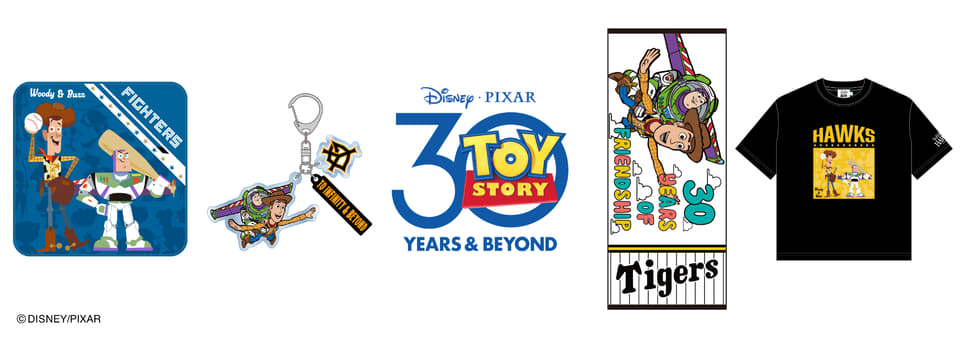 各球団カラーにあわせ、Tシャツ(大人5280円/キッズ4840円)、ハンドタオル(1760円)などをラインアップ。また、トイ・ストーリー映画公開30周年を記念して特別アートを使用したアクリルキーホルダー(1320円)、フェイスタオル(3080円)も揃える。
