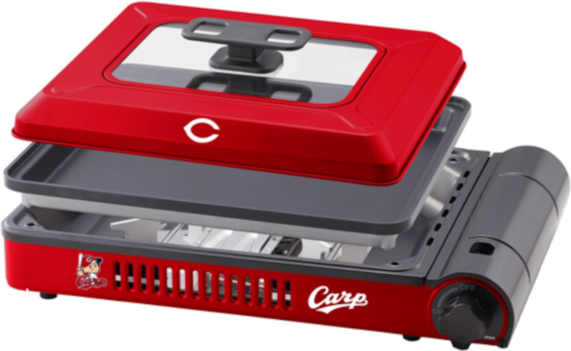 広島グルメのお好み焼きと、岩谷産業のロングセラー商品「焼き上手さん」の親和性を背景に開発。フタ部分にはカープのシンボル「Cマーク」を、本体には「カープロゴ」と「カープ坊や」をデザインし、チームカラーである鮮やかなレッドで仕上げた。