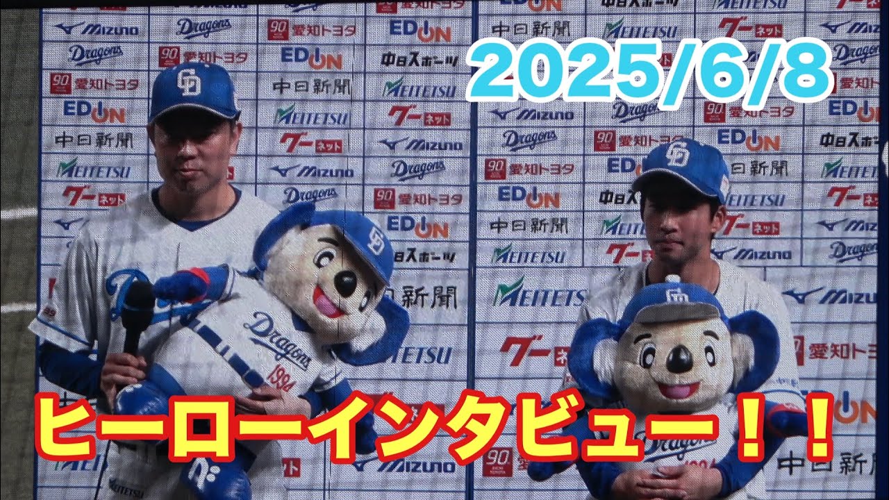 のです 放送席放送席そしてバンテリドームにおまれたファンの皆さん黄色インタビューですドラゴ 3連勝です [拍手] まず松投手にお話聞いていきます7 [拍手] 回無点ナイスピッチングでしたありがとうございますあの攻めながらもいつも通りの粘りのピッチングで見事に 7 回まで抑えましたピッチング振り返っていたいてよろしいでしょうか えそうですねえっと味方の大プレに助けて もらいながら石も頑張って引っ張ってくれ てたのでそれになんとか答えることができ てるかと思います そして皆さんも1つ気になっているところ だと思うんですけれどもデッドボール 大丈夫でしたかえね今の時点であの確実な とか言えることはないですけどまもちろん 次の週も投げるつもり でラウダーが出ている金選手が貴重な先制 点ました その時のお気持ちを聞かせていただいてもよろしいでしょうか そうですね岡林がいい形で繋いでくれてね昨日のヒーローミ上がったのでな何とかしてくれると思ってたので本当にいい活躍をしてくれているかと思います続いて田中選手です [音楽] 1 つおいとなりますそして昨日とほぼ同じシチュエーションでした まずその指できたことどう思いますか [音楽] え昨日と同じなんですけどえ岡林は決めてくれると思ったのでちょっとこうまた頼りない後輩と感てそして昨日はまた同じマネが来たら次は打ちたいと話していた流れの今日 1つ出ました そこに関してお話聞いて そうですね本日は今日はていうかま打つき満々でえ出入ったのでえま本当ヒットが良かったですけどえなんとかに関われて良かったです同じようなシチュエーションしたら今度はヒットでということですね 次は絶対ヒットします さあ1 周終わりました次の1週間は適での6 連戦となります最後に一言事ファンの皆様に向けたコメントをいただきたいと思いますまず選手でお願いします [音楽] えまずこの6 年生でえ勝ち越しでいきたいと思いますよろしくお願いします [拍手] え前回のヒで優勝するぞ定3 [拍手] 連敗したんで今回流戦絶対優勝するぞ選手皆様の大きな拍手をお願いします Yeah