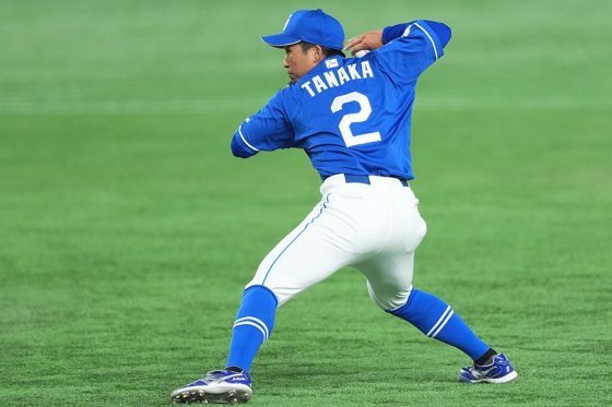 「6番・二塁」で出場した田中が魅せたのは、0-0の初回2死だった。2死一塁で打席には4番のキャベッジ。詰まりながらも内野の頭を抜ける打球を放った。しかし、田中が背走しながら体を目いっぱい使ってジャンプ。見事にグラブに収めると、先発の金丸夢斗投手もバンザイして喜んだ。