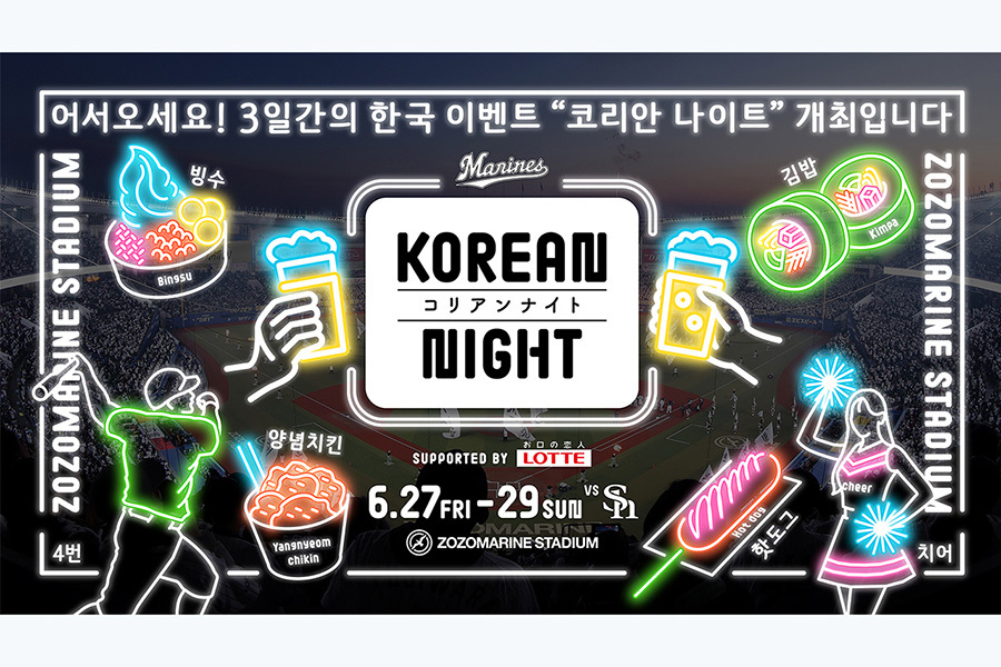 KOREAN NIGHTは、韓国のグルメやカルチャーに注目し、球場外周に韓国の市場を再現したグルメエリアが登場する他、韓国にゆかりのあるゲストが来場するなど、ポップで異国ムードがあふれるスペシャルイベントとなる。27日にはOBの金泰均氏が来場し、試合前の始球式に登板する。