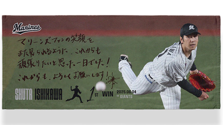 On June 4th, pitcher Shu Ishikawa started in the game against The Giants at Zozo Marine Stadium, pitching well for seven innings with three hit no runs, earning his first win since transferring to the team. The lineup of commemorative goods this time includes 23 products, including autographed photo files, face towels, and T-shirts, and the eight products, including the face towels, are available in two types: main visual and handwritten message.