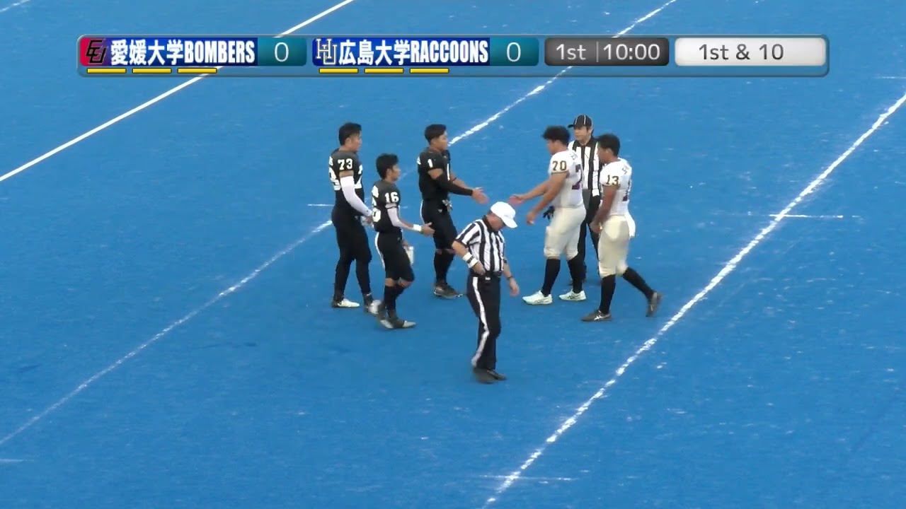 アメリカン フットボールかつて少し前にこの競技を 題材にした漫画がありましたいじめから 逃げ回るうちに身につけた快速武者少年が 主人公でしたそれに魅了された友が感が赤 が集まり奮闘しかつてはいじめたもたちが 彼らの影に入って助けとなり影のため一度 は離れた仲間が戻り脇を固めなる教王たち に挑み倒していくそんな夢のような物語が ありました 今ここにその世界が生まれようとしてい ますかつてもてはやされたあの際しな世界 がここに再現されようとしていますもしか するとここから世界は激に動き変わるのか もしれません皆様こんにちは道楽やです令 和6年9月7日場所は広島公益公園第2 球技場にて2024中四国学生アメリカン フットボール周期1次リーグ第3節の1戦 愛媛大学ボンバーズ対広島大学ラクーンズ の一戦が間もなく行われようとしています 試合開始17時30分キックオフ予定と なっており ます両チームその試合に先立ちまして共に ウォームアップをえ最終調整に入っており ます両チームのご紹介をさせていただこう と思いますまず本日はホワイトですが ホームチームという形でこのフィールドに 現在4年なく調整をしておりますのががえ え愛媛大学ボンバーズ [音楽] です総武1976年え勝利という目標の ために人間力の工場を目指すというチーム 方針に基づき毎年常に非常に研ぎ澄まされ た少数制ながら素晴らしくアメリカン フットボールIQ高い選手を排出しており ます近年ではえX2で活躍をしております 竹内や藤田といったええ様々な選手を排出 している中止国の一由でもあります 今シーズンのメンバースタッフもえこちら の方に並べさせていただいておりますので 是非ご覧くださいまた配信の説明概要欄に も同じく掲載してさせていただいており ますもし並列してご覧いただくことが可能 であれば皆様是非こちらもご注目 いただければえ選手たちの応援に熱が 入れるかと思いますので是非ご利用 くださいえ愛媛大学は今え全えまずえ第2 節で戦いまして残念ながら黒星発信という ことになっておりますがこの1戦にえ リーグリーグそして決勝トーナメント進出 をかけてこの1戦挑んでまいりますえ姫 大学ボンバーズの紹介をさせていただき まし た対しまして本日は反対側に陣取りますの が地元広島にその今日をきます広島大学 ラクーンズ ですこちらは1977年こちらも歴史あり ますえアメリカンフットボールチームです 常に中四国アメリカンフットボールのその 筆頭の1位を確と毎年優勝遊に絡んでおり ます競合税でもありますえしかし近年はえ その人在充実しながらも山口大学の躍進に よりまして区pleをなめ続ける2年間を 過ごしました2024年まさにその復建を かけた1戦という形で今シーズンこの開幕 戦を挑んでくる形になりますこれが秋の はめえ最初の1戦と山え広島大学はなり ます信用はこちらにもう掲載させており ますが中四国では非常に優れえ素晴らしい アメリカンフットボール経験者やそして アメリカンフットボールに関連する競技 経験があります選手を揃えており人材面に おいては非常に優れた広島大学ランズご 紹介させていただきまし [音楽] たこの領有によります秋の本番の一戦が間 もなく行われようとしており ますこの両チームの現状に関して簡単な形 でありますが現時点での中国の状況 ましてご紹介させていきます今シーズンの 中国学生リーグはえ10代の1部2部の形 で分けていたものを全て並列化しまして6 校全ての総当たりの格好で甲子ボール トーナメント出場争格好になりました双方 3チームえ3校に分けましてのリーグ戦を 行いその上位の1位2位を持っての決勝 トーナメントをしそれによって甲子ボール 出場者を決めるという格好になりますえ この良行は共にBブロックに所属しており ますがBブロック現在一戦行われており ましてその対象とにやす愛媛大学は現在 いっぱいという状況になっております愛媛 大学として見はここがえまさに瀬戸際と いう状況になりましたこの1戦で勝利でき ないとこの時点でトーナメント敗退という えリーグ戦敗退トーナメント出場不能と いう形になりましてここで今シーズンが 終える格好になります何としてもこれを 開始するためにはこの試合を勝利しなけれ ばいけません言い換えますと広島大学は ここで勝利しましと後の対戦相手となり ますのは工事大学1項ということになり ますのでここで何としても有利な状況を 作るためにもこのを勝利したいというその ような状況に良行あるという一戦になり ます本来ならばホームチームである愛媛 大学はあえてホワイトをまったのはまさに その排水の人をにするそのような形で自分 たちの身を引き締める形の挑戦者としての え取り現れかという風に私は取らせて いただきたいと思い ます早速チャットのメッセージありがとう ございますトルテ様このブロックを面し 面白くするためにも頑張り愛媛大学の メッセージこれも愛媛大学に非常に強力な エールになると思われ